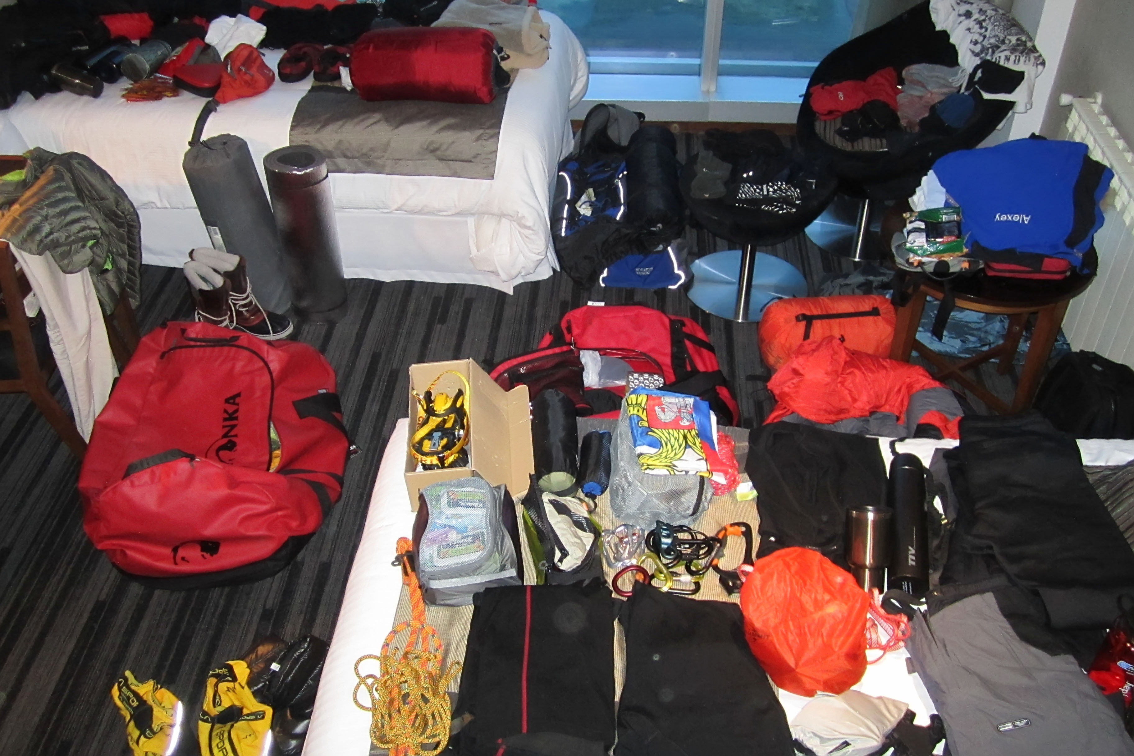 Весь оставшийся вечер – разбор снаряжения и одежды, проверка всего необходимого вместе с Кейтом, отсев неподходящего/ненужного (4 пары белья, например, считаются излишеством, как и лишние перчатки) для уменьшения веса. Это вопрос не праздный – одних перчаток предполагается до 4х слоев, не говоря о штанах и куртках, и все либо на себе, либо в санях за спиной. Составление перечня необходимых закупок. Почти все орехи и сухофрукты отняли на таможне, где царят строгие правила ввоза органики. Теперь надо это докупать обратно, плюс шоколад, вафли на перекус и ром на вечер.