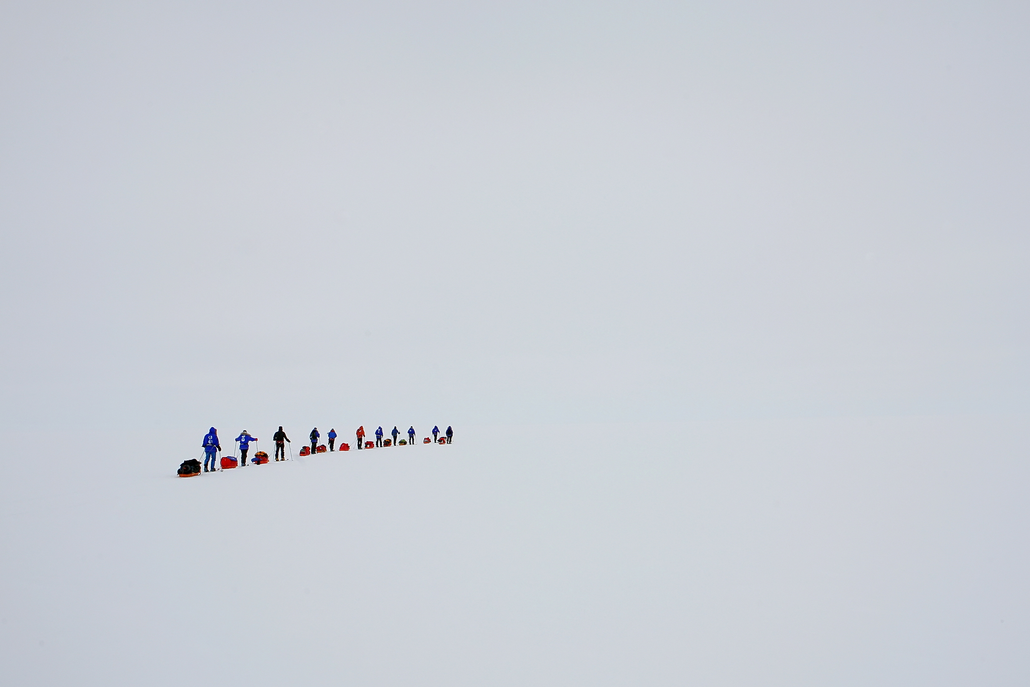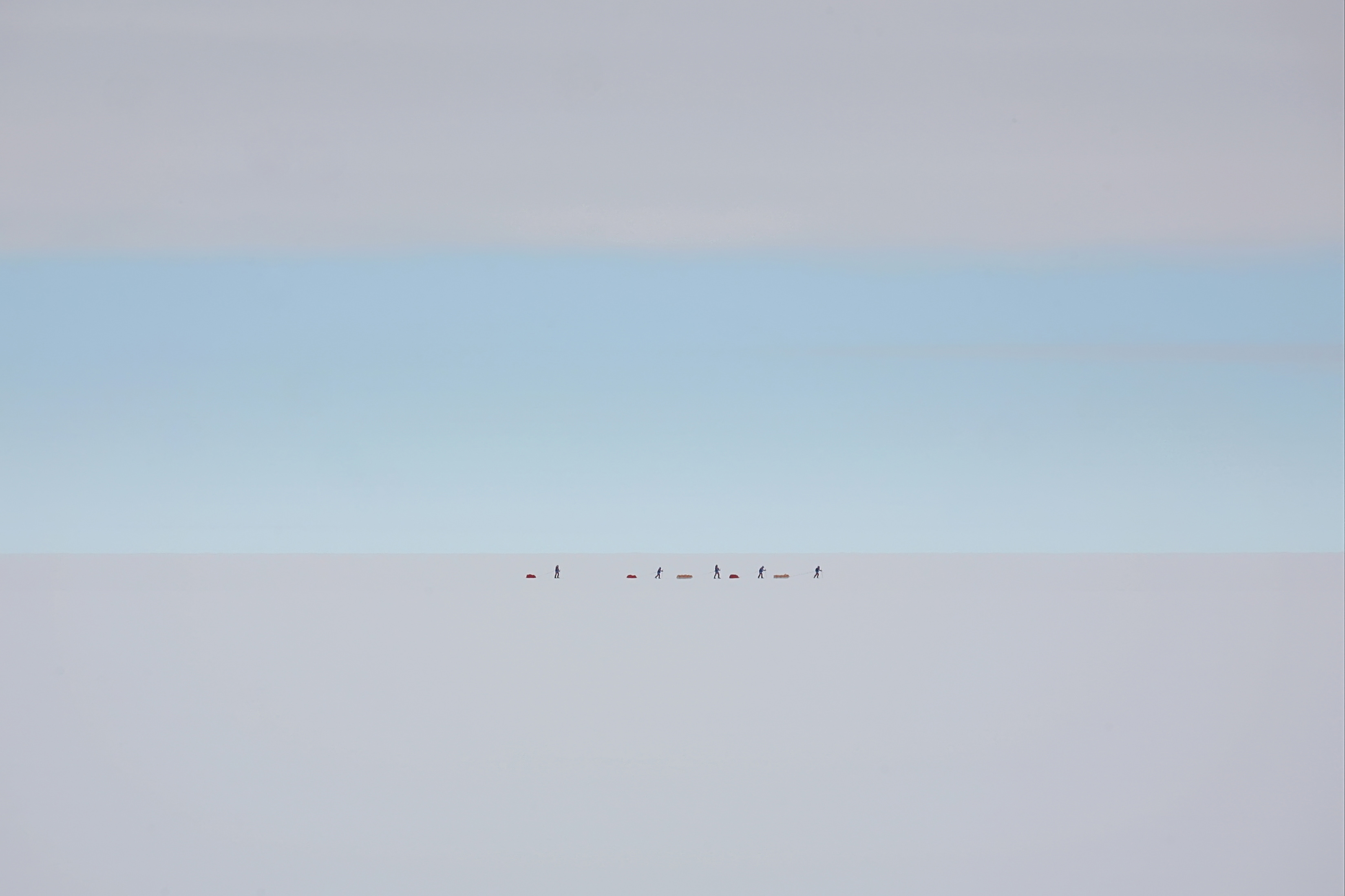 Первые 3 смены проходят отлично, по-прежнему -25С, ветер 5 kts. После первых 15 минут тело входит в уже привычный ритм, а в голове запускается мыслительный коллайдер. Пейзаж не меняется, движения монотонные. Взгляд уперся в сани впереди идущего – и впереди несколько часов наедине с собой.