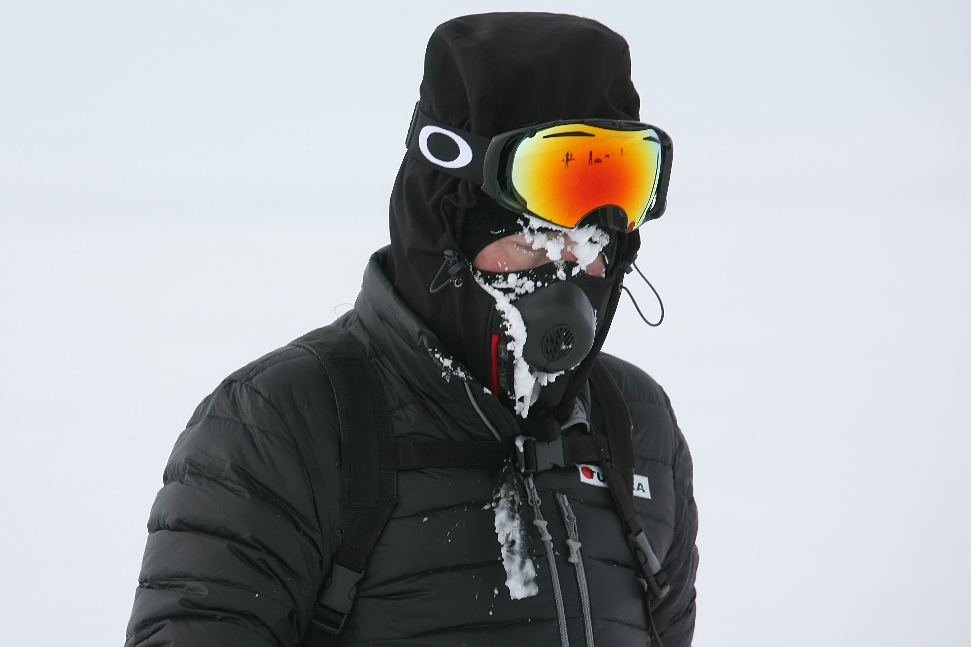 Сегодня идти тяжело – помимо температуры и ветра, которые дают уверенные -35С, свежий рыхлый снег не дает на лыжах перемещаться никак, кроме как шагом. Через 15 минут уже одышка и усталость – а учитывая, что по плану 9 nm (16км), сделать еще остается 30,000 шагов (0.5 м каждый). Когда об этом думаешь, то очень сложно заставить себя идти по неизменной белой пустыне. Физически я готов, но морально это настоящее испытание. Вообще, сил пока достаточно, и это было хорошей идеей начать тренироваться за 4 месяца. Сегодня именно такой день, каким я себе представлял его в Антарктиде, заставляя себя идти в зал, а не в паб.
