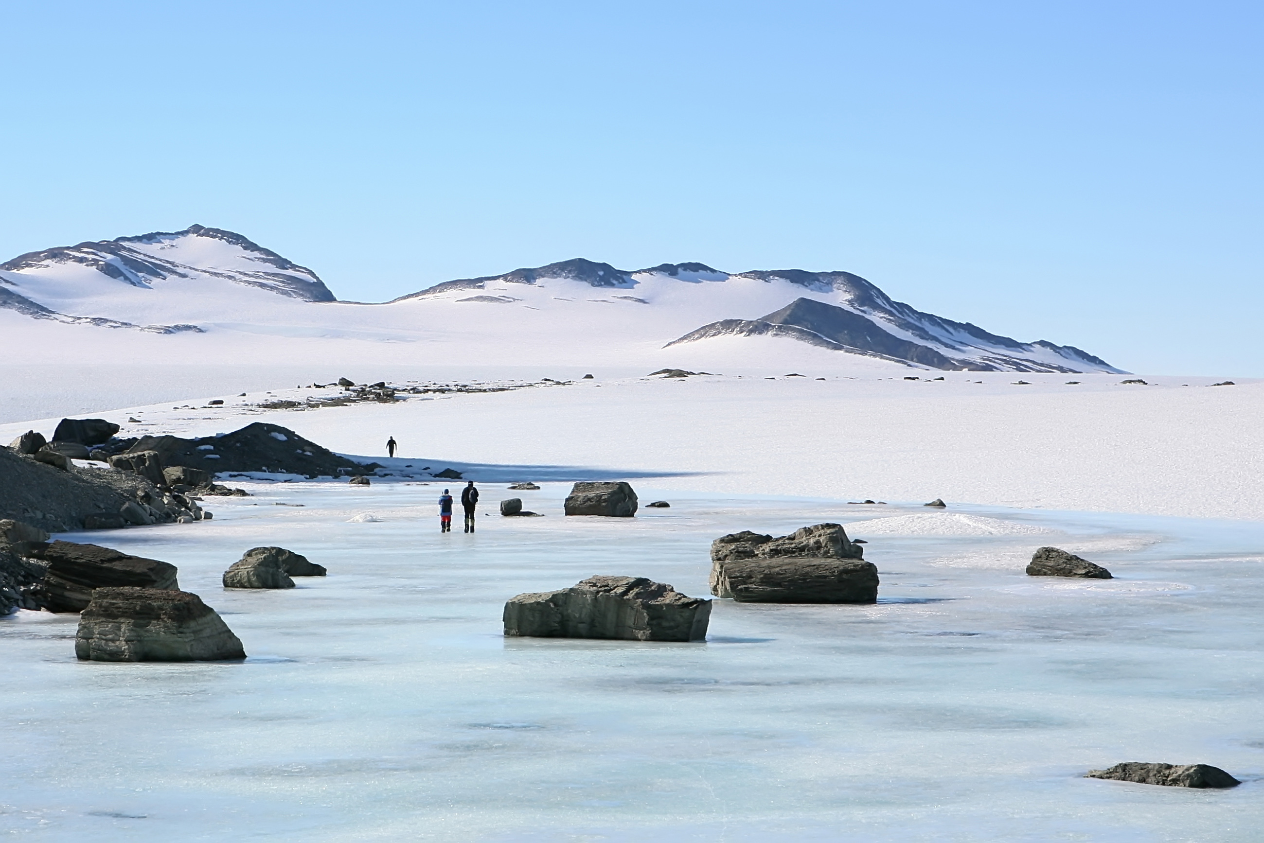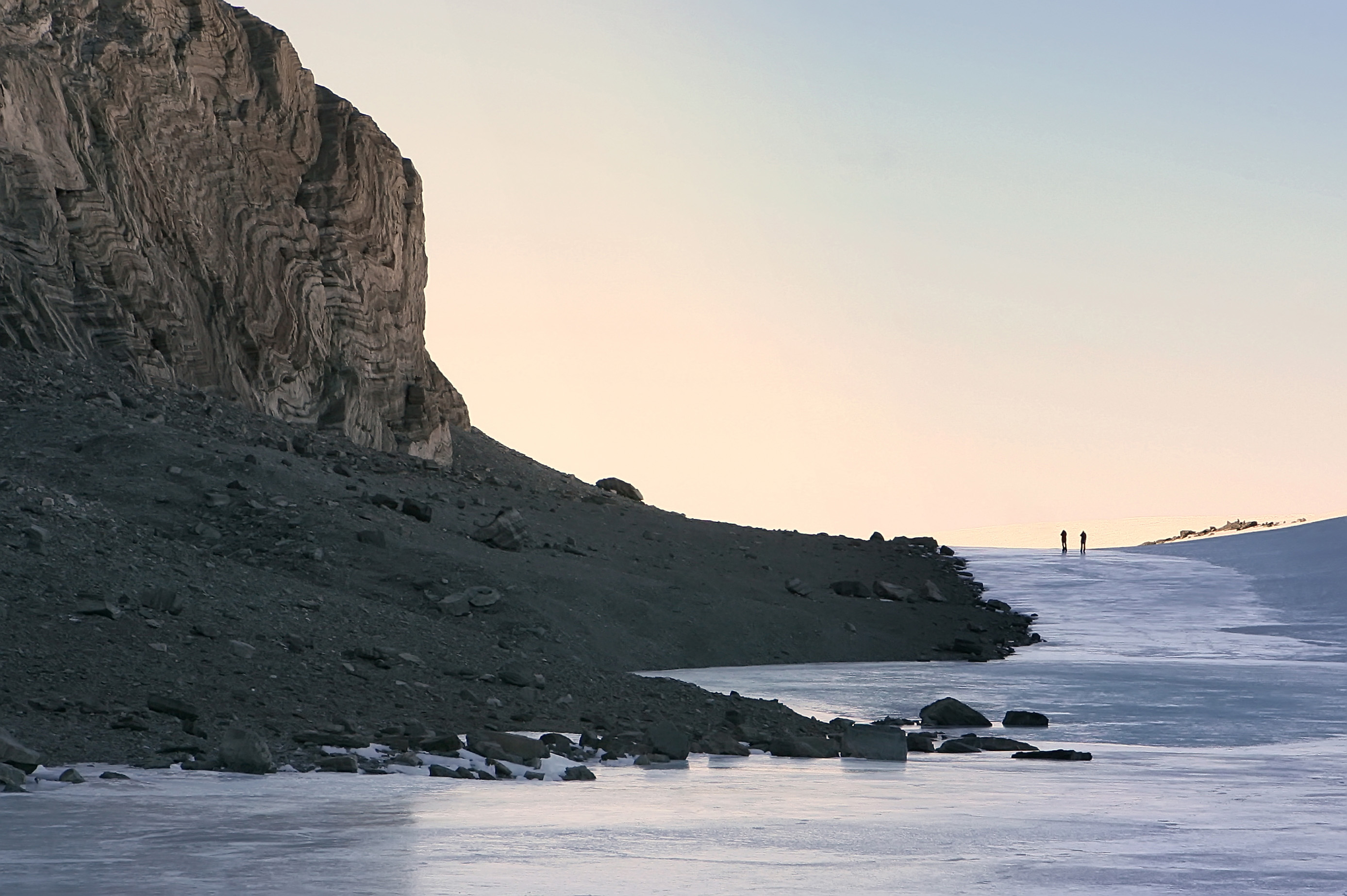 17-го января снова раздувает 40 узлов. Хожу по лагерю во флиске, очках и палаточных тапках, хотя только 2 недели назад обязательно в куртке, шапке и ботинках со вставкой. После холодного полюса очень хорошо, как весна, хотя и -5С. Чтобы скоротать время, ездим на машине по окрестностям, гуляем по леднику.