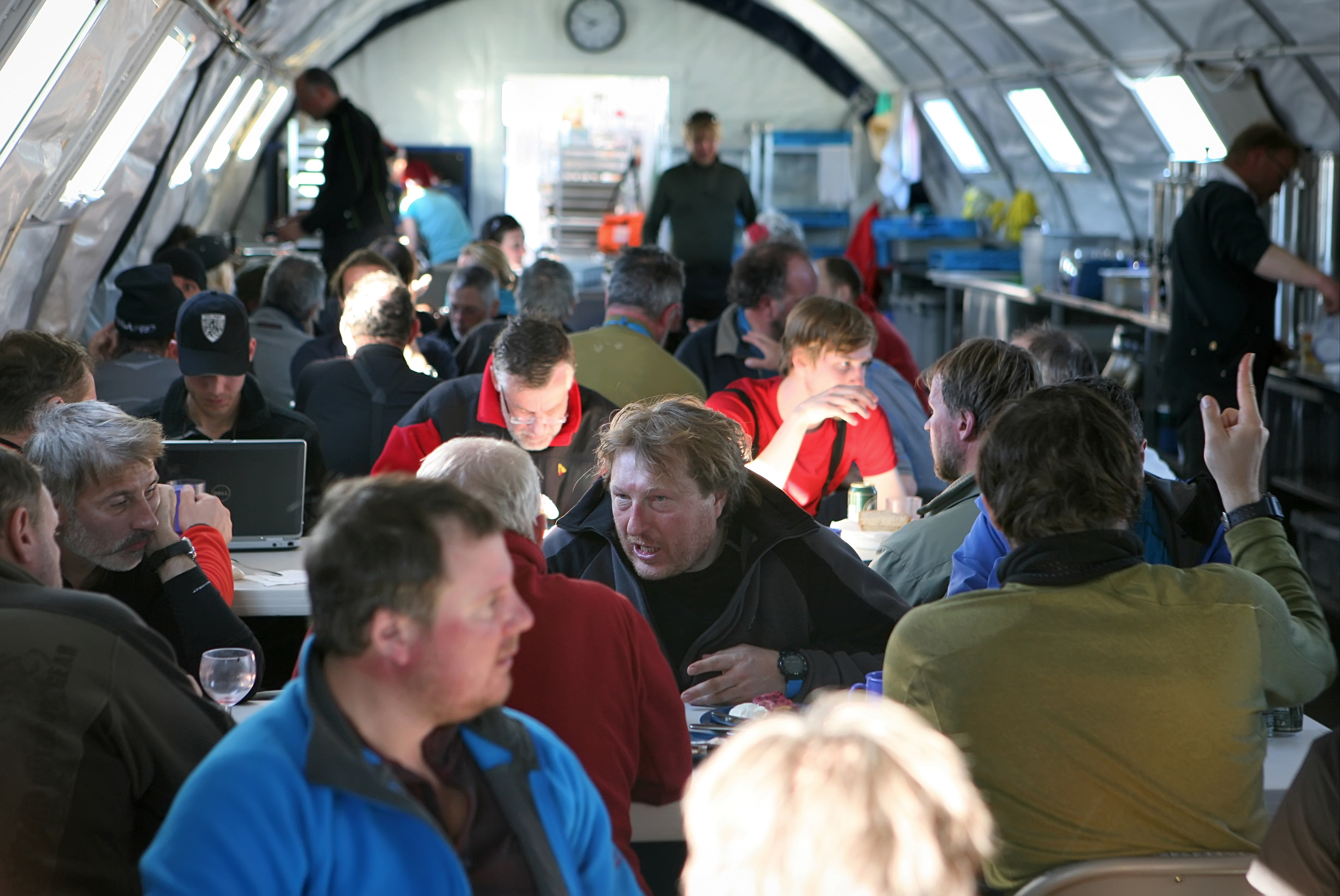 Уставшие (особенно англичане), решаем сначала поесть, выпить, отогреть фотоаппараты (несмотря на солнце, по-прежнему около -30С), и всем вместе идти на Полюс.