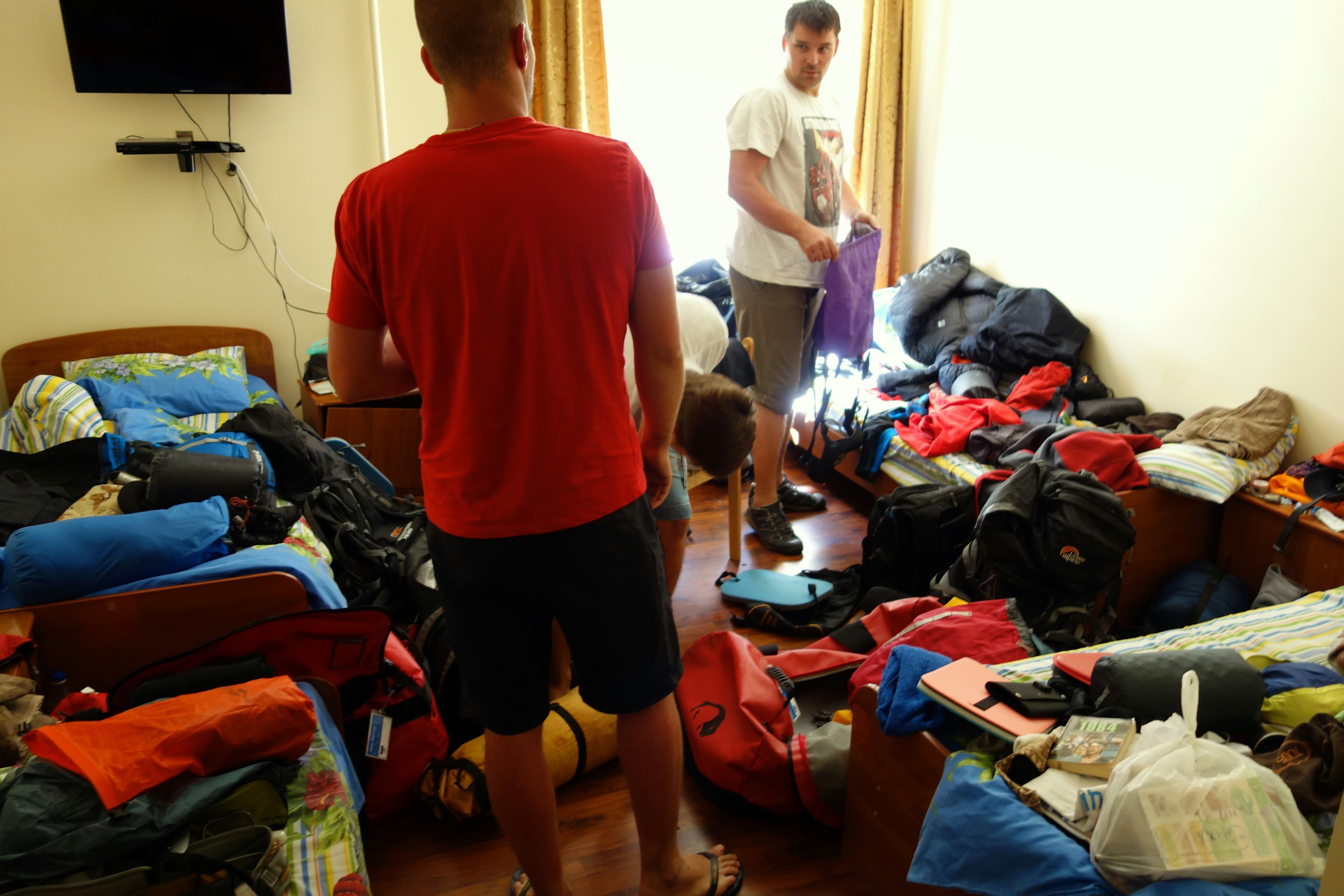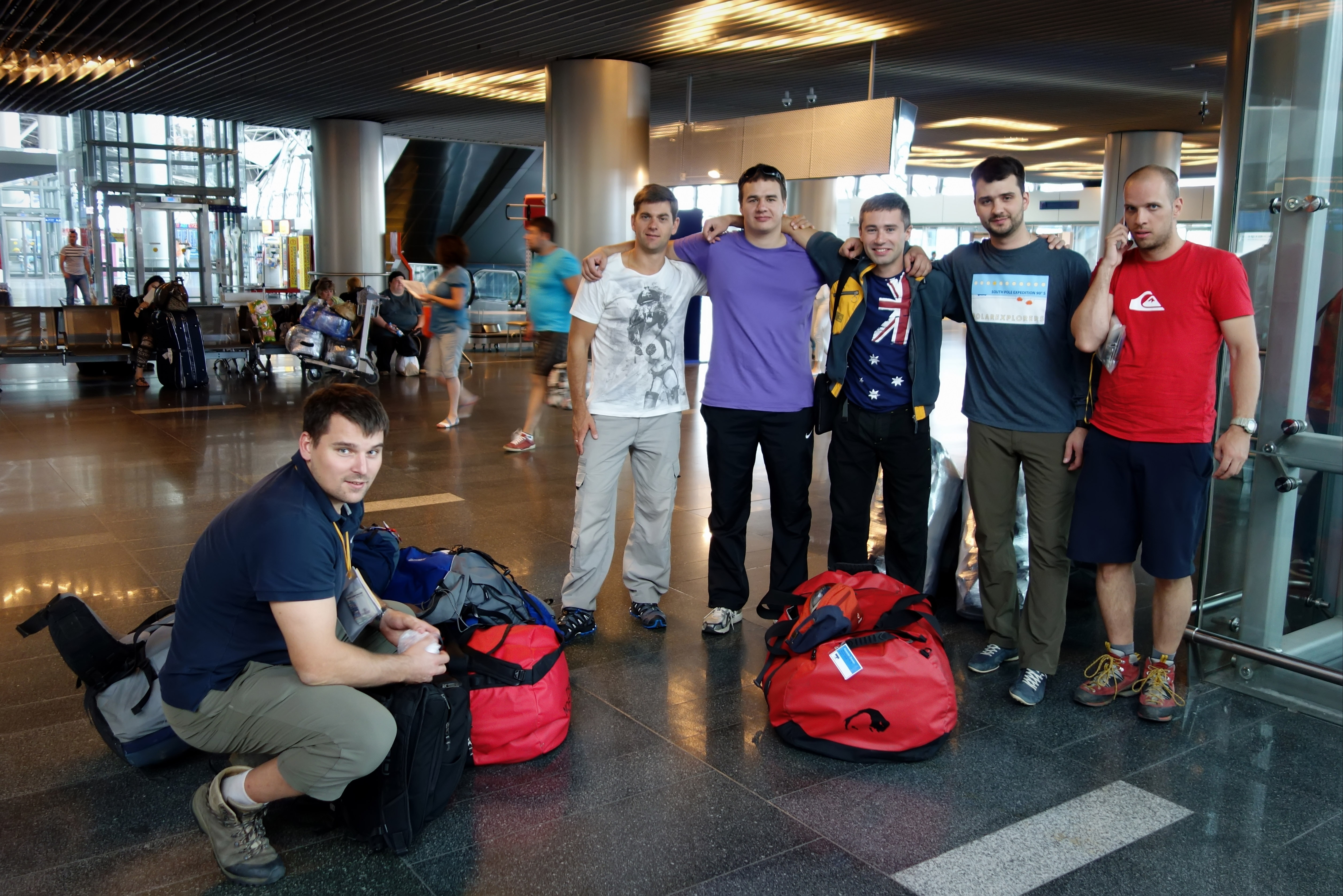 День 1. Наши годы тем временем в среднем около 30, нас семеро и мы встретились пятничным июльским утром в терминале Внуково – Андрюха, Леша, Даня, Митяй, Ден, Дима и Зозо. Лимит на багаж в ЮТэйр всего 20кг, но дополнительное снаряжение, которые мы везли из Москвы для наших гидов, не позволило в него вписаться. Милые девушки за стойкой регистрации расспрашивали про большие баулы, но все равно заставили платить за полный перевес – за спинами студенток сидели хмурые проверяющие.