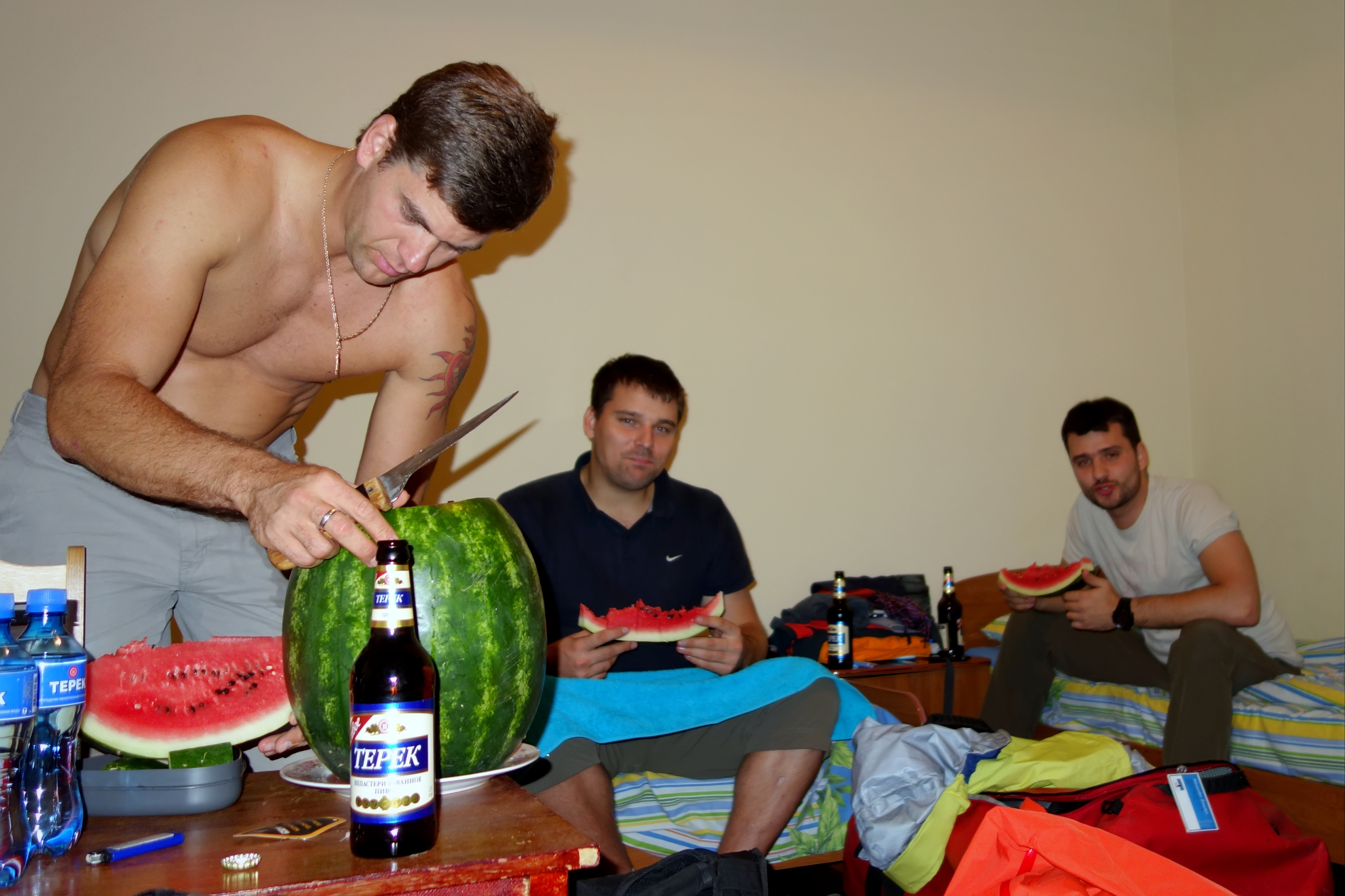 Остаток дня свободен – гиды скомандовали отдыхать перед завтрашним радиальным выходом. Для этой цели, а также из соображений скорейшей акклиматизации, передовой отряд разведки обнаруживает арбузы и пиво Терек (для местного колорита).