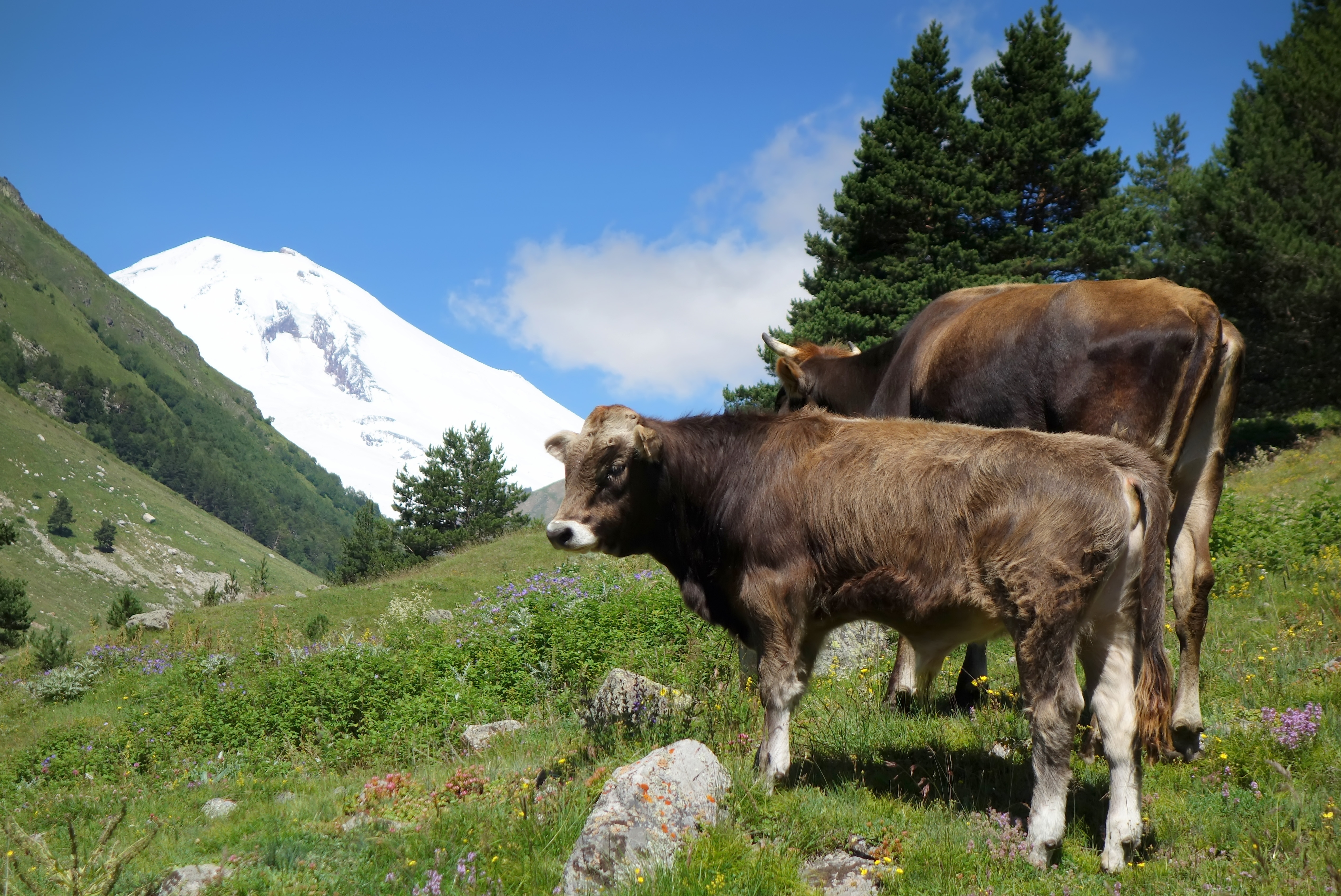 Далее мы плавно набираем метров 300м и перед глазами открываются холмистые волны сочных изумрудных лугов, разрезанные пополам горной речкой. Тут и там попадаются упитанные и ленивые коровки, как на картинках импортного сливочного масла. Вдалеке показывается красавец Эльбрус, контрастируя громадными белыми шапками ледников с с ярко-зеленой цветущей долиной.