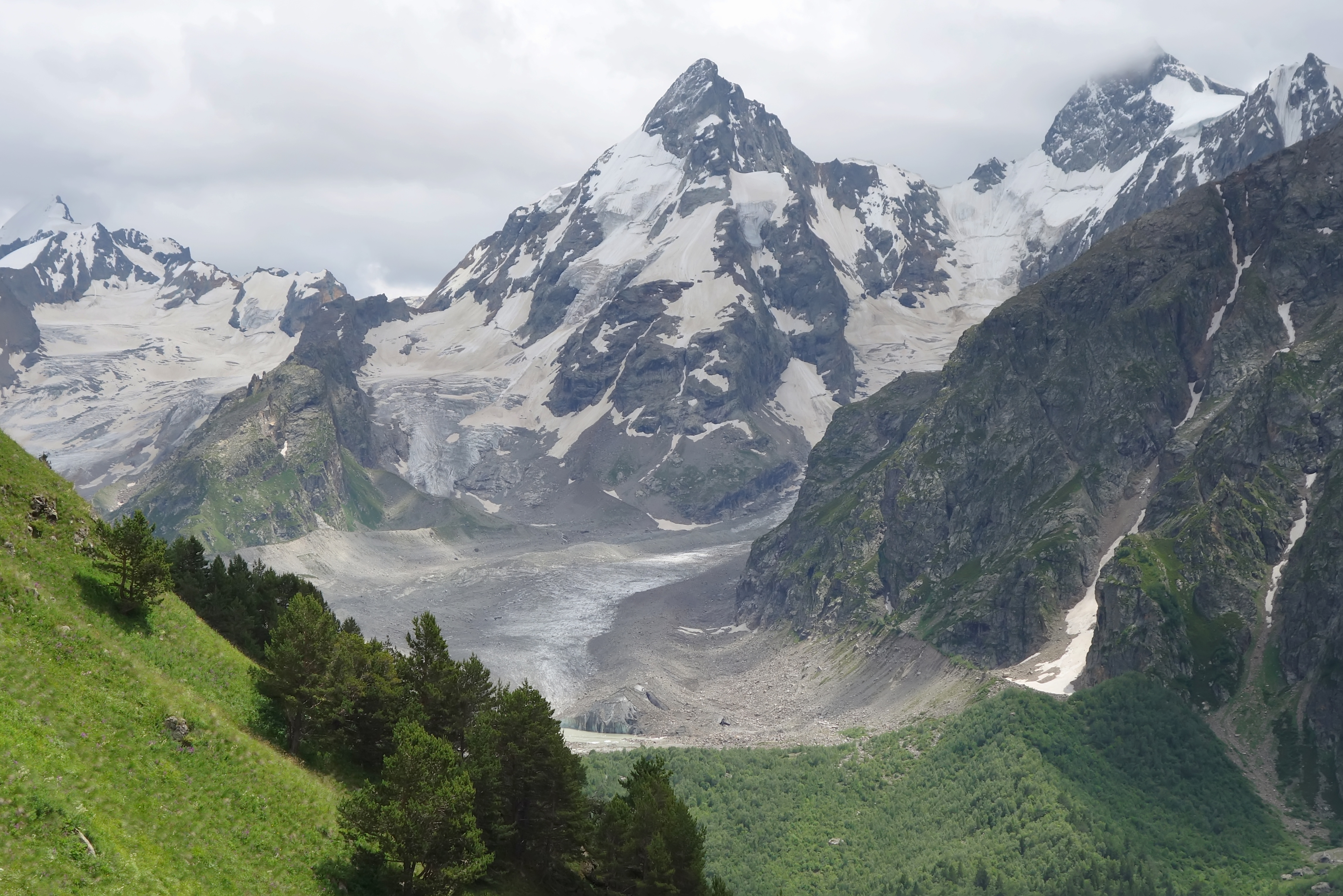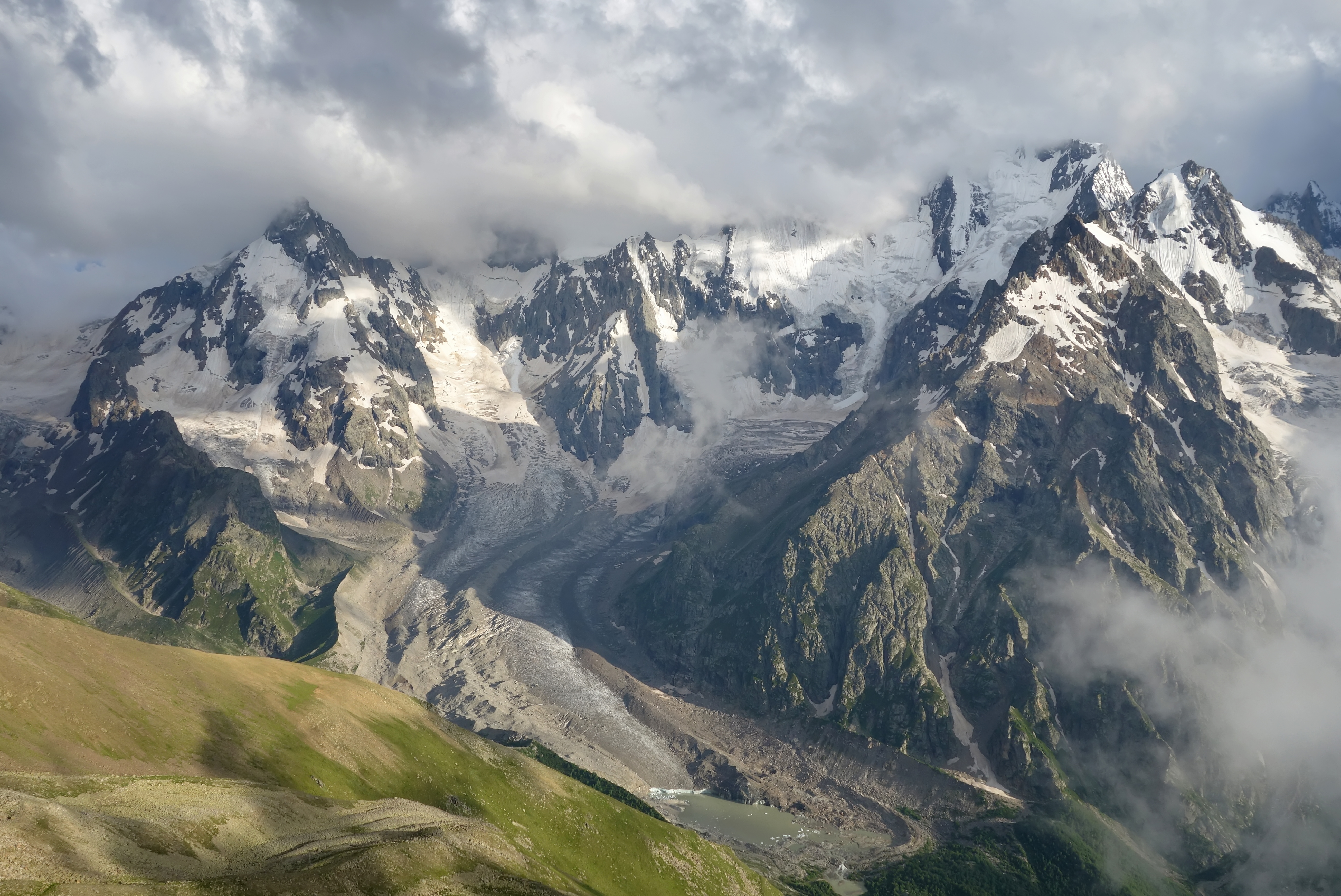 В пасмурные моменты низина превращается в реку тумана, а в солнечные – открываются острые снежные вершины горной гряды напротив и самого Эльбруса где-то там справа. Ледники становятся не грязно-серой массой, а искрящейся бело-голубой рекой, как будто лишь на миг застывшей ледяной лавиной.
