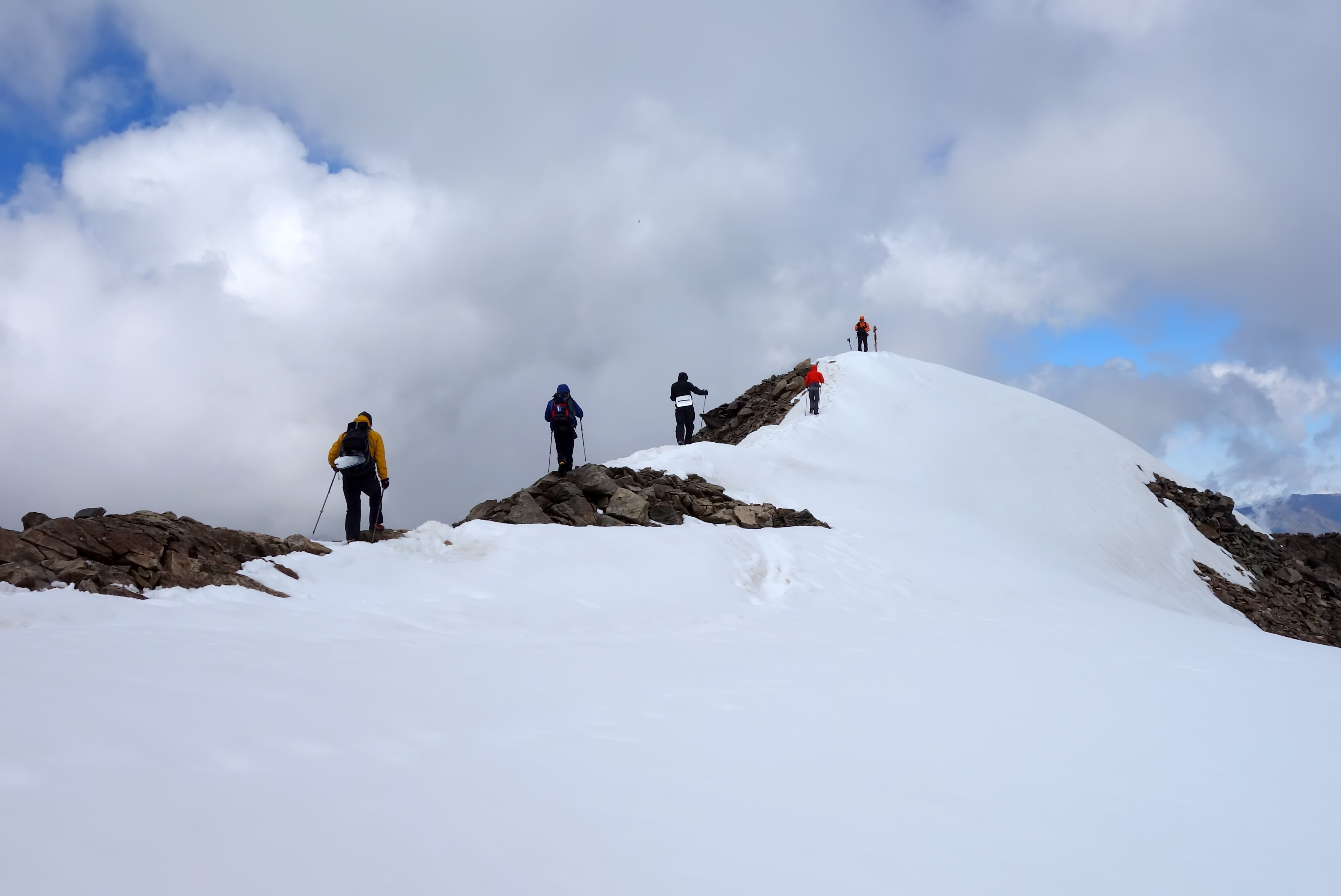 Прохождение косой полки занимает 4 очень долгих часа. Перед последними 10м до поворота к седлу стою несколько минут отдышаться, сил практически нет. Все начинают замерзать, а это плохой звоночек. Ден и вовсе говорит, что на одной ноге пальцев не чувствует. Надо принимать решение, что делать дальше – устраиваем привал, чтобы оценить состояние каждого. До вершини около 300м по высоте и 2-3часа по времени.