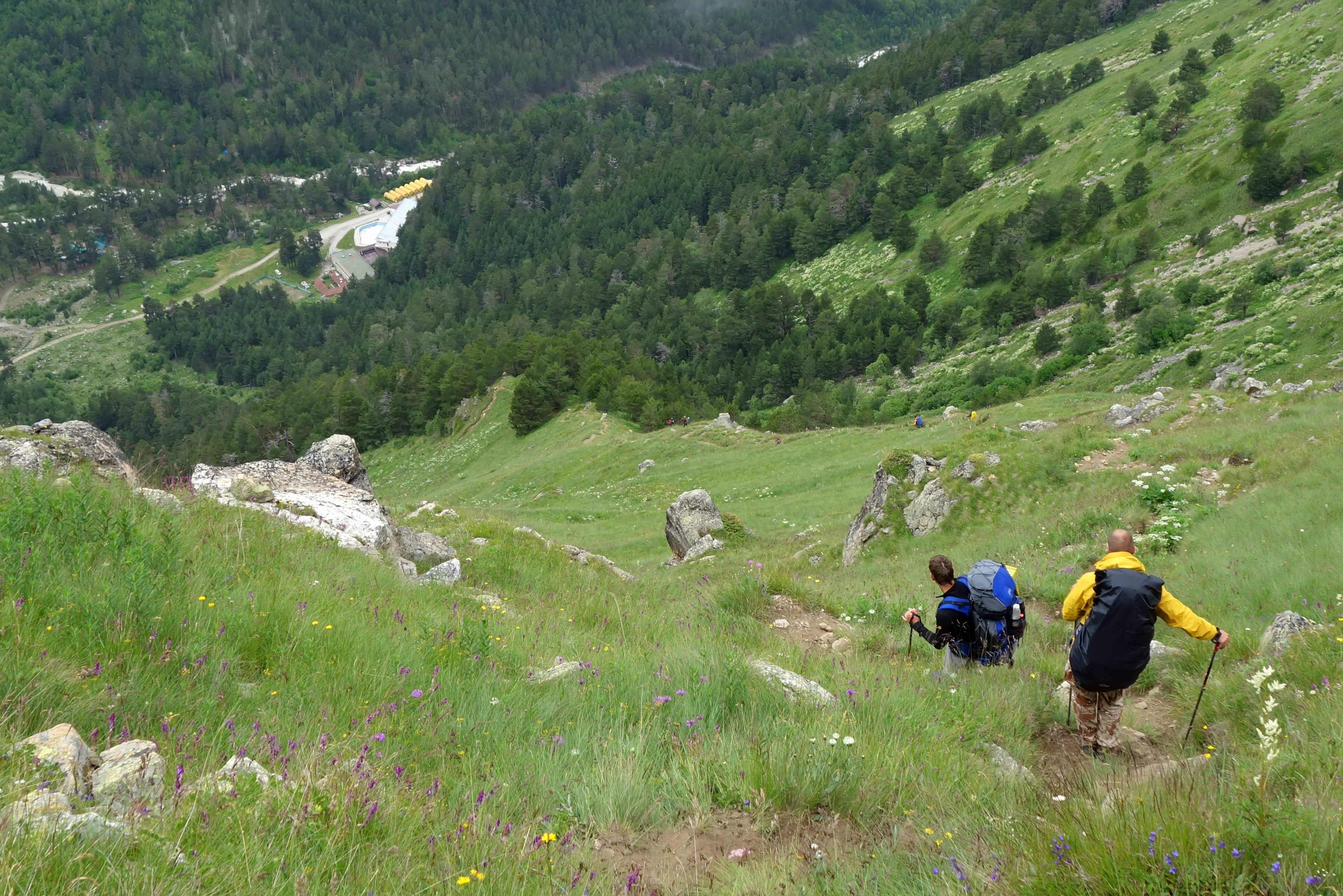 Сказано, сделано – 13.55 стоим у базы. Спускались методично, без лишних остановок, и только раз посидели попить и переодеться, когда пошел, наконец, дождь. Сделал он это на самом крутом и травянистом (читай, скользком) последнем отрезке – двое ребят, поскользнувшись, немного проехались на пятой точке, а остальные просто проверили качество дождевиков.