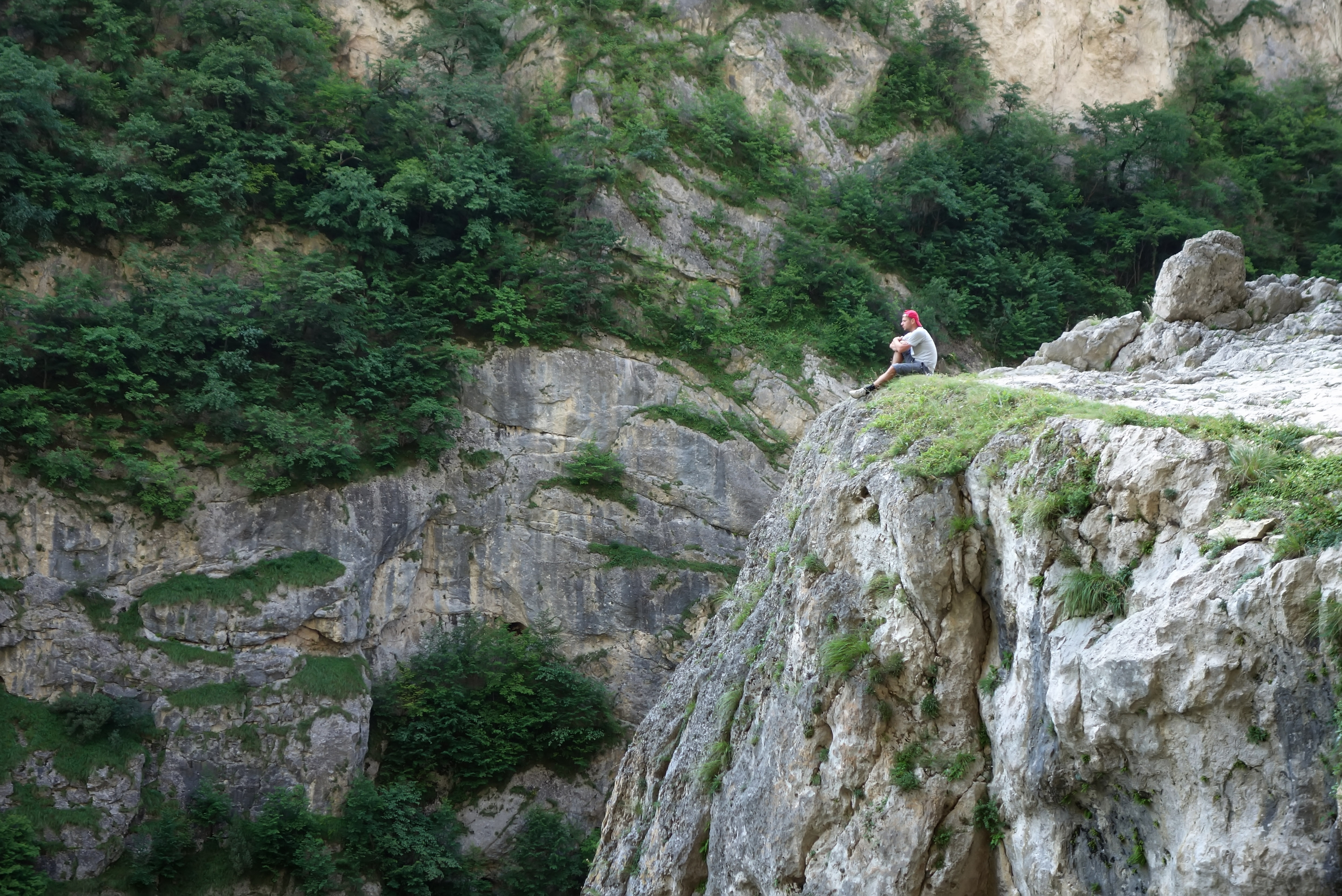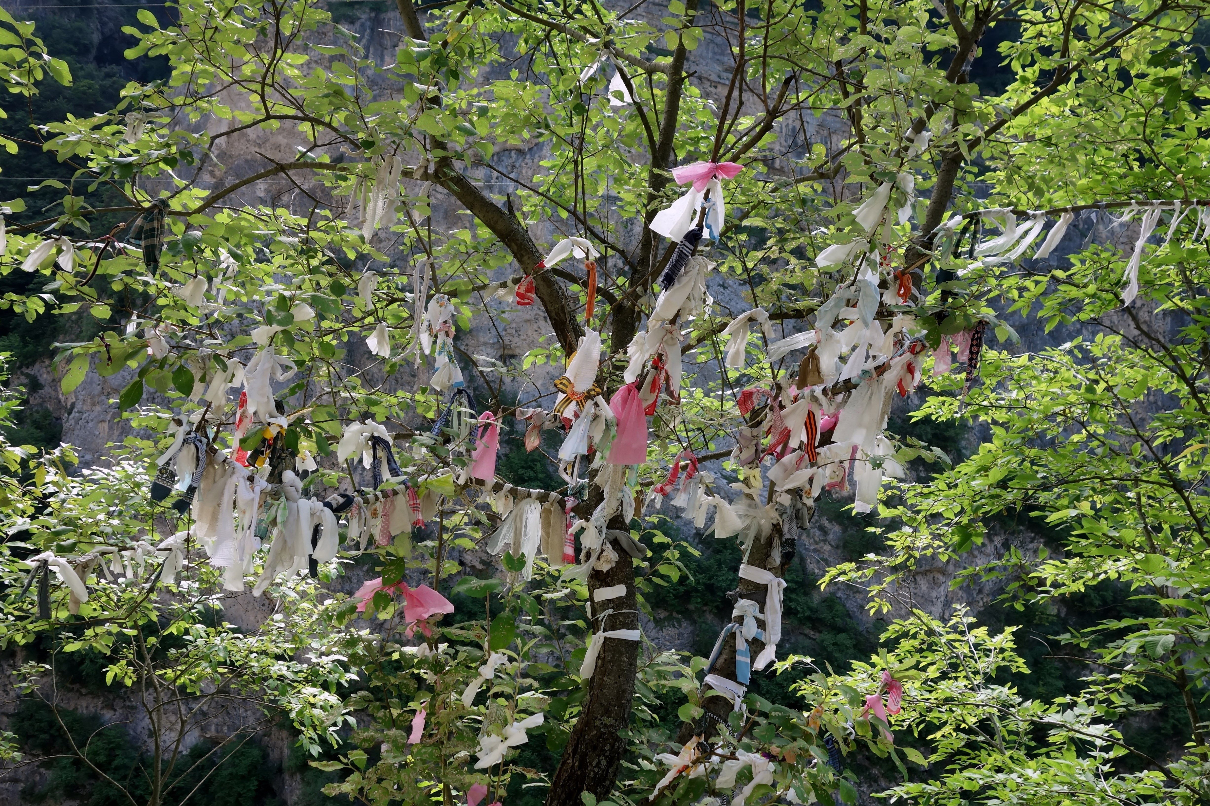Раньше до него добирались по тропинке, бегущей по самому краю обрыва. На этой тропинке тут же множится количество фотокарточек. Низкорослые деревья вдоль обрыва обвязанны ленточками, как в Непале, и мы тоже привязываем каждый по одной – на удачу.