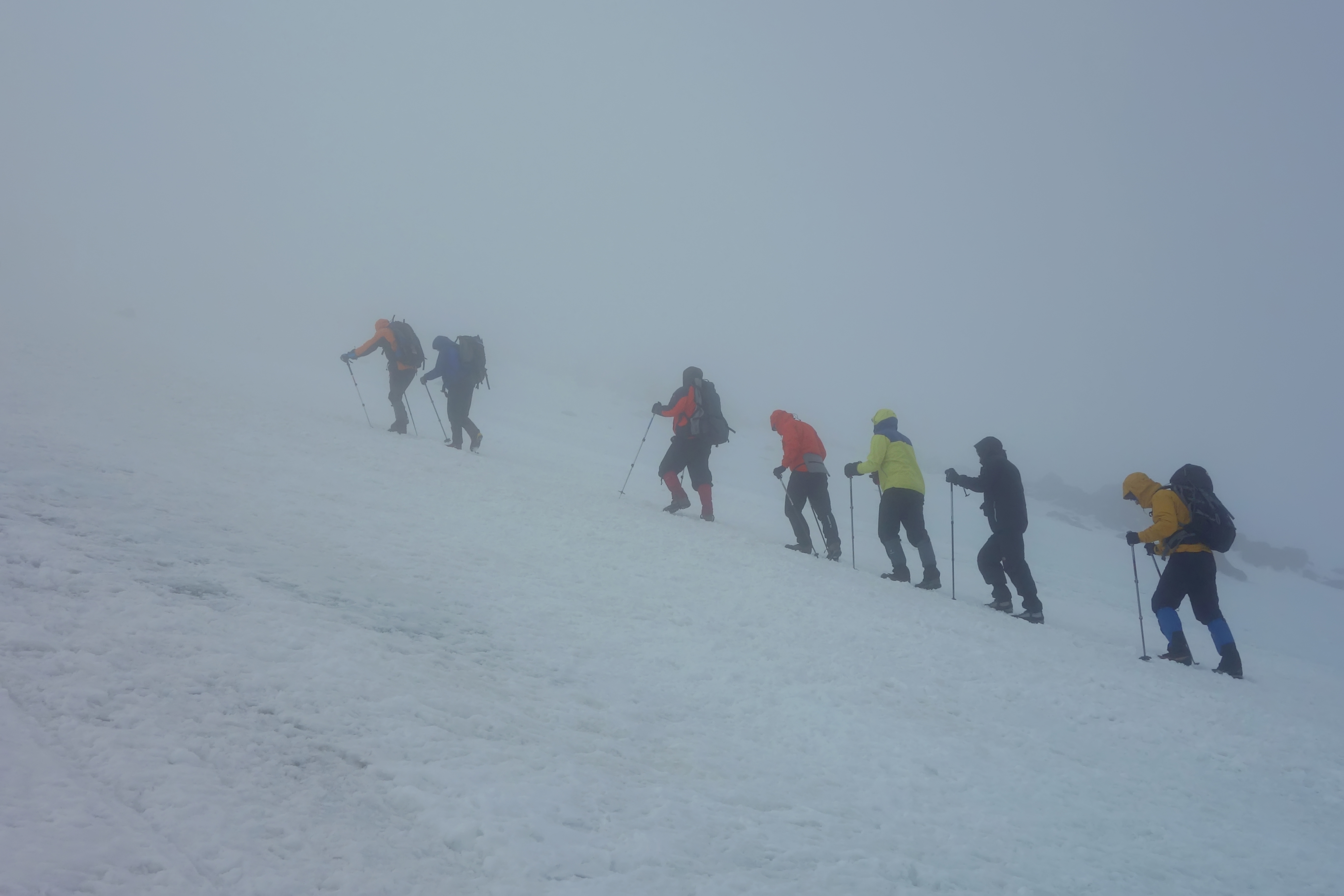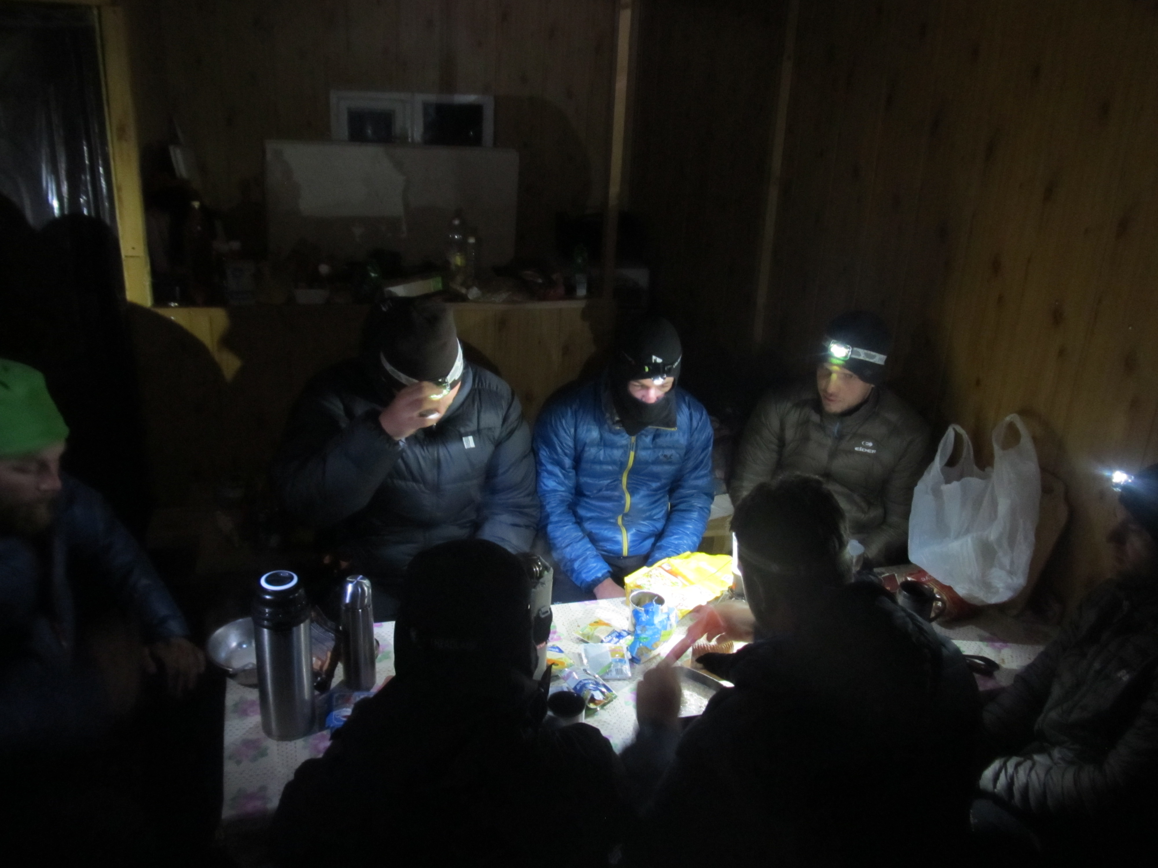 День 8. В 2 часа утра нас будит Кирилл. Рассказывает, что в час ночи был сильный ветер, потому и отложил подъём. Будить, в принципе, особо и не надо – сон у всех рваный, отрывистый, как какое-то похмельное забытье. Я даже рад, что заканчивается, наконец, волнительное ожидание пары последних дней, и мы идем навстречу тому, зачем приехали. Завтракаем и собираемся. На голову фонарик, а в рюкзак – кошки, пуховку, термос, аптечку, пуховые варежки, балаклаву и очки, забыть которые ночью легче легкого.