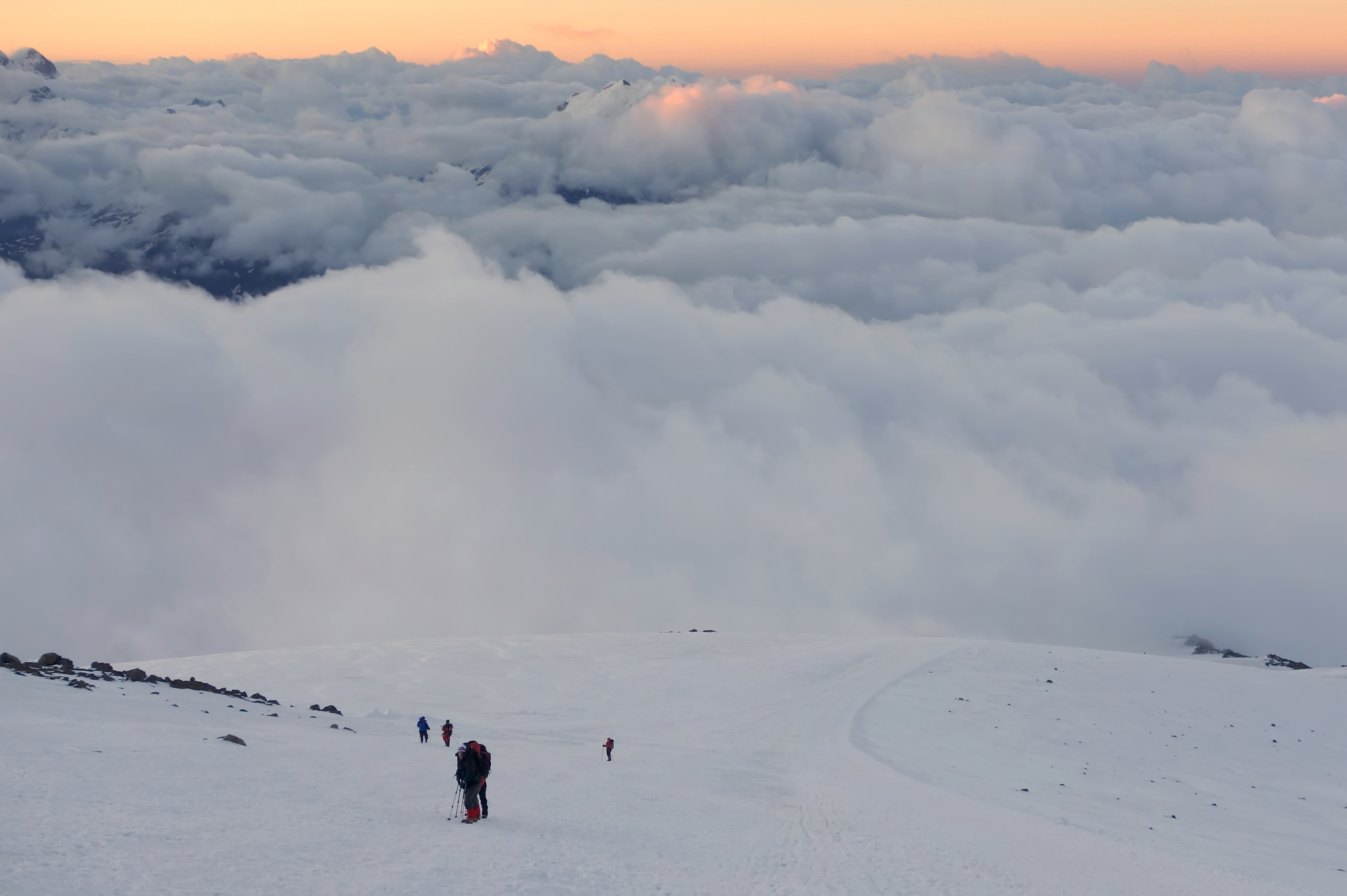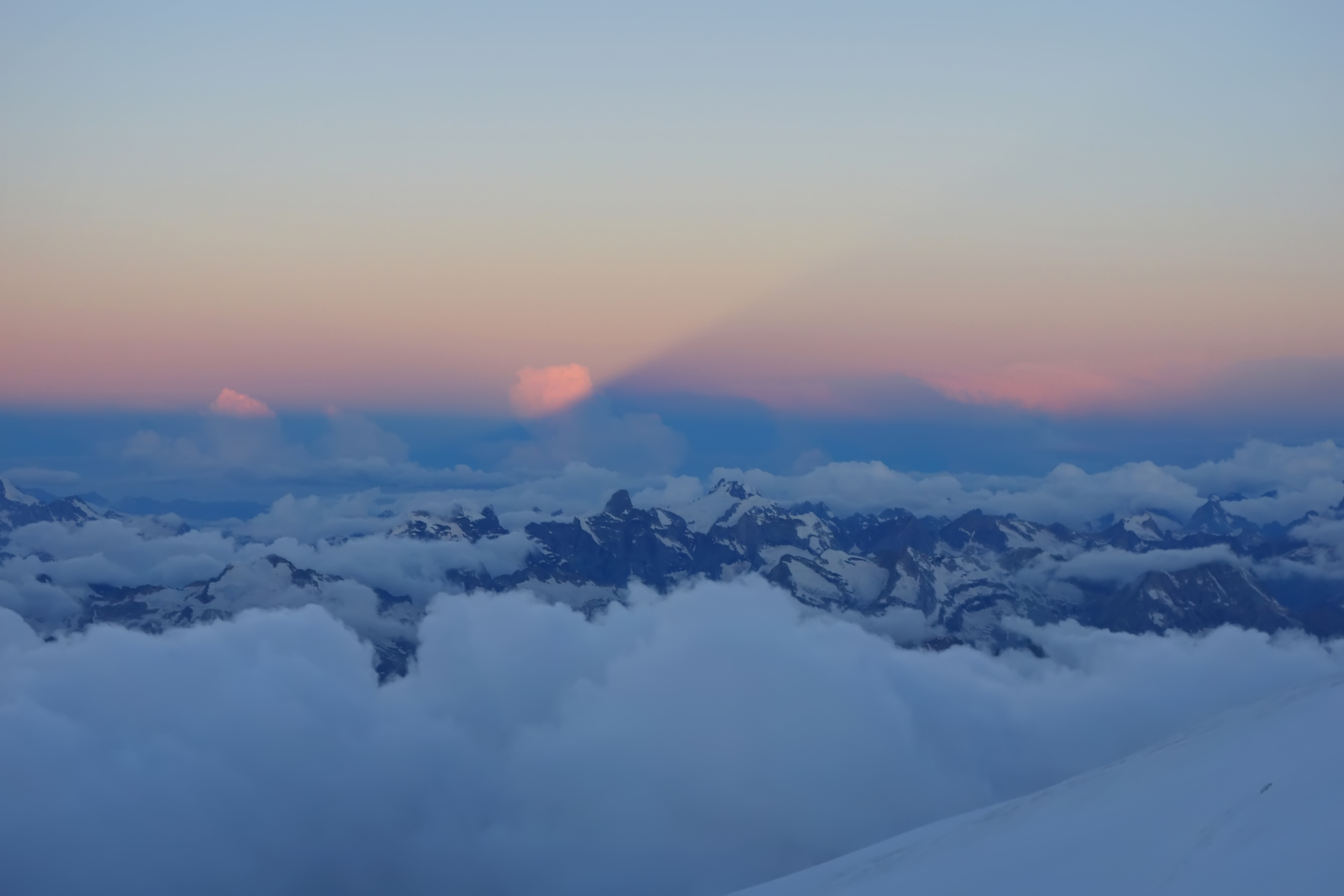 Рассвет застает нас между 5.30 и 6.00, пока мы надеваем кошки перед ледовым полем между скалами Пастухова и косой полкой. Это примерно 300-400 метров набора высоты по довольно крутому склону, и приходится петлять галсами. Этот отрезок мы преодолеваем еще за 1.5 часа, причем ветер, поднявшийся над Пастухова только усиливается, заставляя надеть пуховку и кутаться в воротник. Все это время рассвет играет красками и тенями, выхватывая соседние вершины, расцвечивая облака и отбрасывая гигантскую тень от вершины.