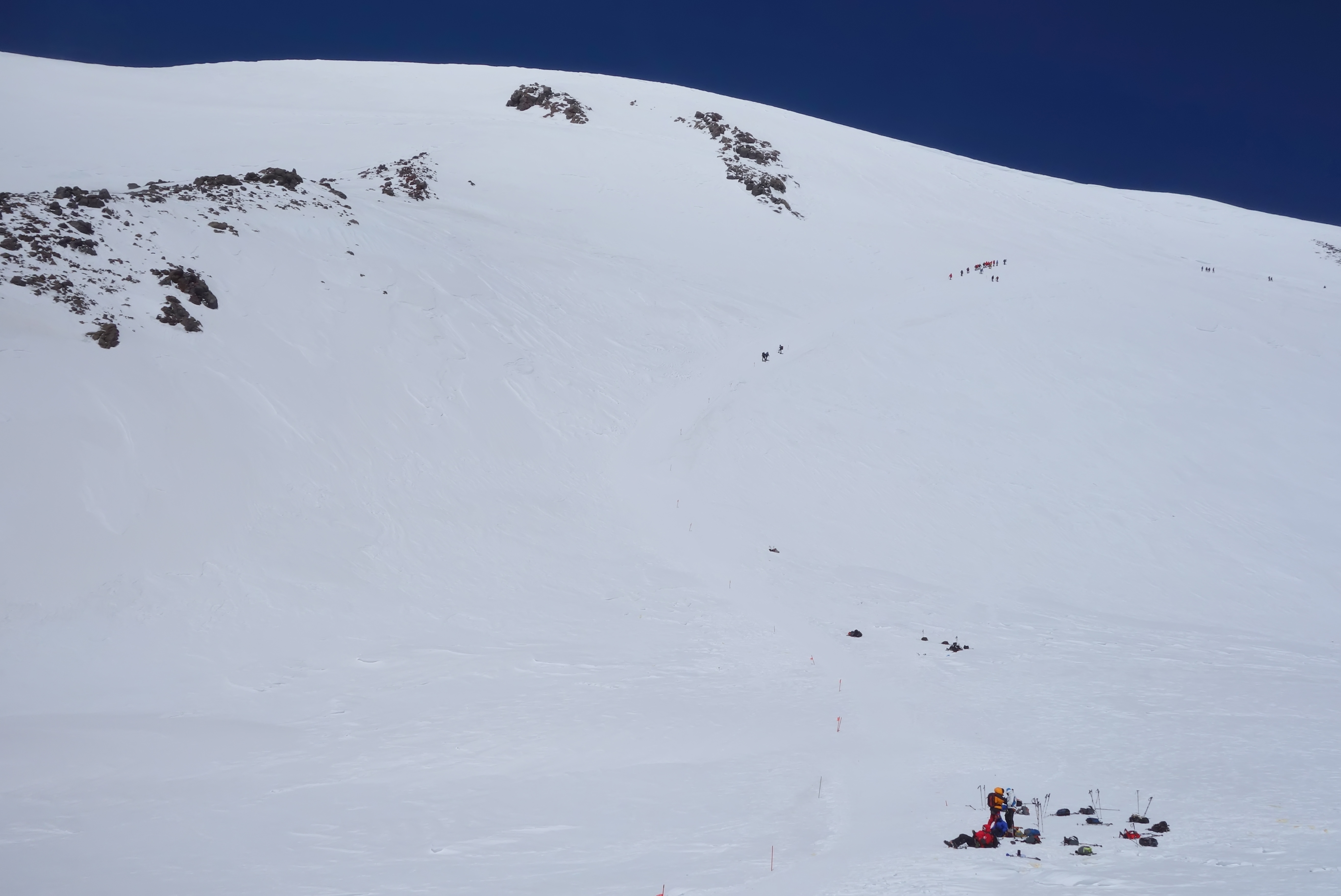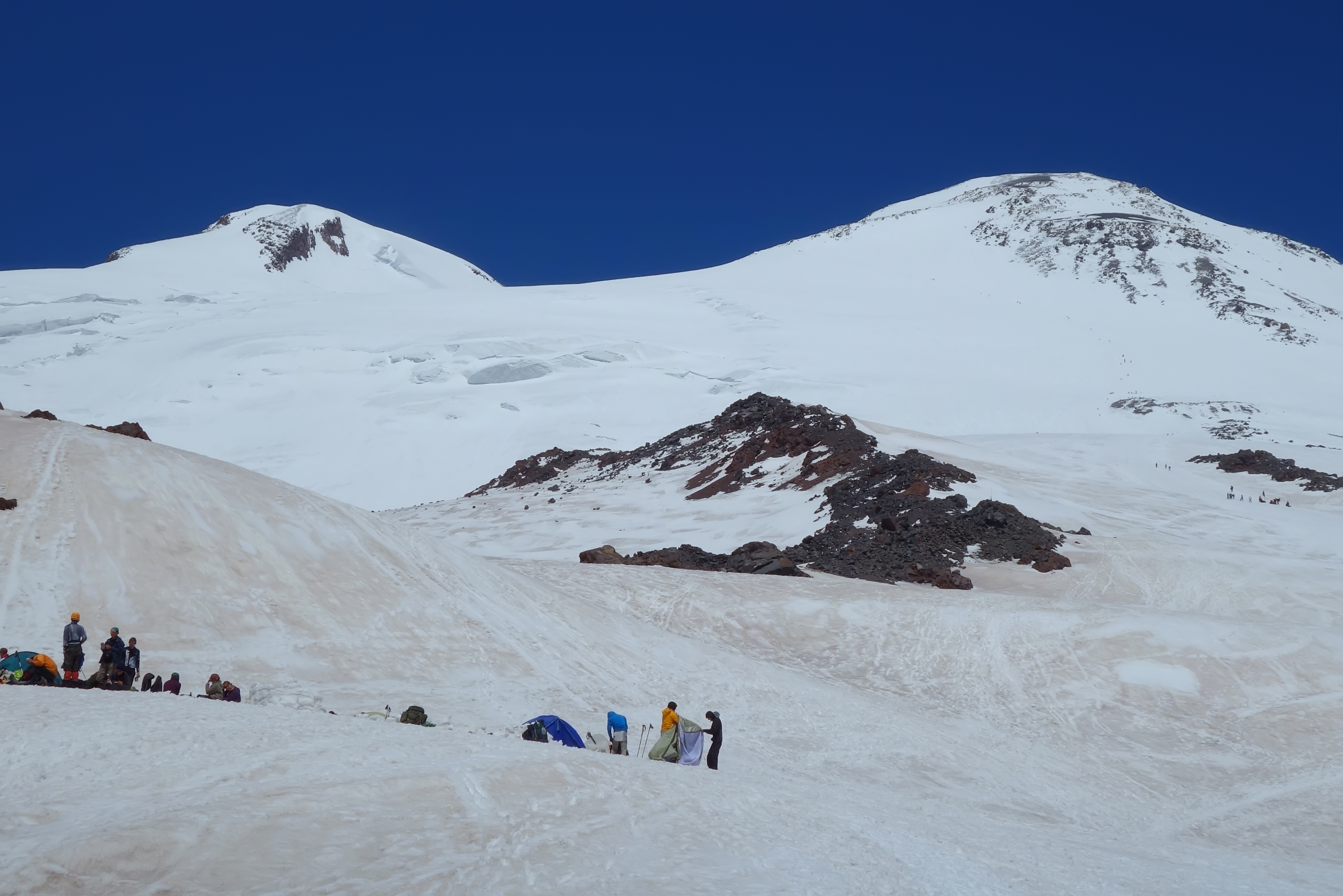 Пока доходим до скал Пастухова на 4700м, мимо проезжает штук 7-8 ратраков, везущих группы на склон в диапазоне 4700-5000м, чтобы стартовать оттуда. Считается, что это не спортивно и к тому же небезопасно – высота так набирается слишком быстро и организм может отреагировать по-разному. Говорят, несмотря на такую фору, эти группы устают быстрее и шансов подняться на вершину не сильно больше. Головой это прекрасно понимаешь, но все равно начинаешь им немного завидовать.
