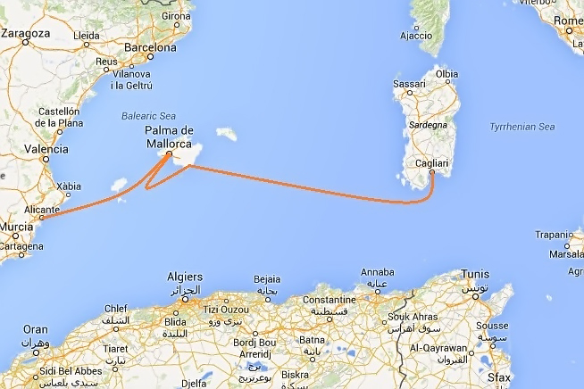 Маршрут был ориентировочно такой: выход из Кальяри, переход к Балеарским островам параллельно побережью Туниса и Алжира, далее мимо Майорки и Ибицы к континентальной Испании, потом Картахена и, в идеале, Альмерия. Первую половину задуманного получилось реализовать в соответствии с планом, а единственным минусом был довольно слабый ветер, не превышавший 7-8 узлов, заставляя помогать мотором удерживать скорость на уровне 5-6 узлов (около 10 км/ч). Берег исчез с первым закатом и не появлялся следующие два дня. Ночи были звездные и светлые, волна небольшой, хотя в первый день с непривычки меня прилично прикачало.