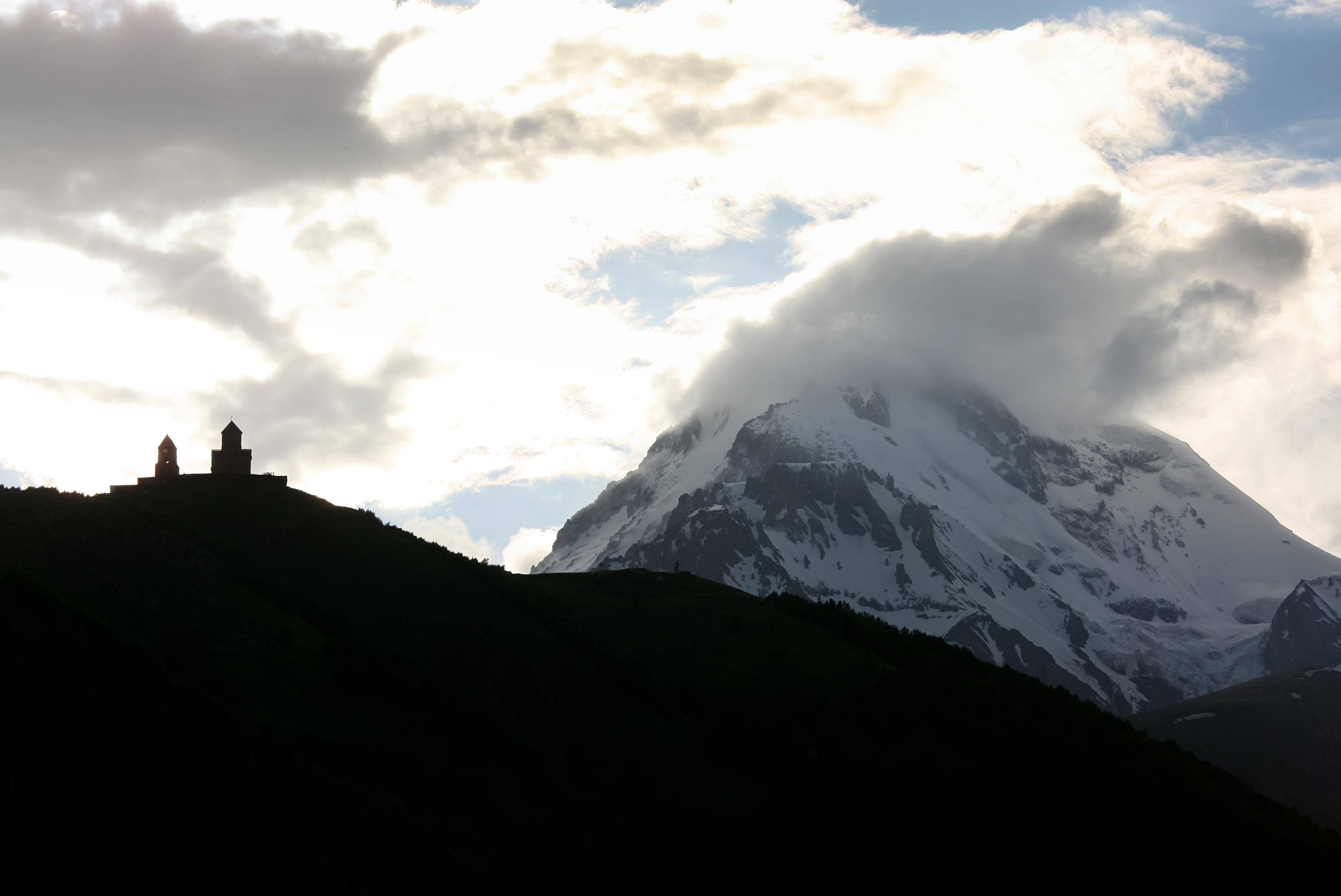 С погодой, однако, не повезло – гору удалось увидеть за плотной шапкой обложных дождевых облаков лишь один раз ночью, когда мы сидели у костра с гитарой и соседями по лагерю, веселой грузино-белорусо-испанской компанией. Под моросящим дождиком и со смешанными чувствами досады и облегчения лагерь пришлось сворачивать и спускаться в долину. Там не было дождя, зато были арбузы и вино, хлеб и сыр, река и заброшенная башня для исследований. А в Степанцминде – уютное кафе с лучшими хинкали и коллекцией грузинского пива.