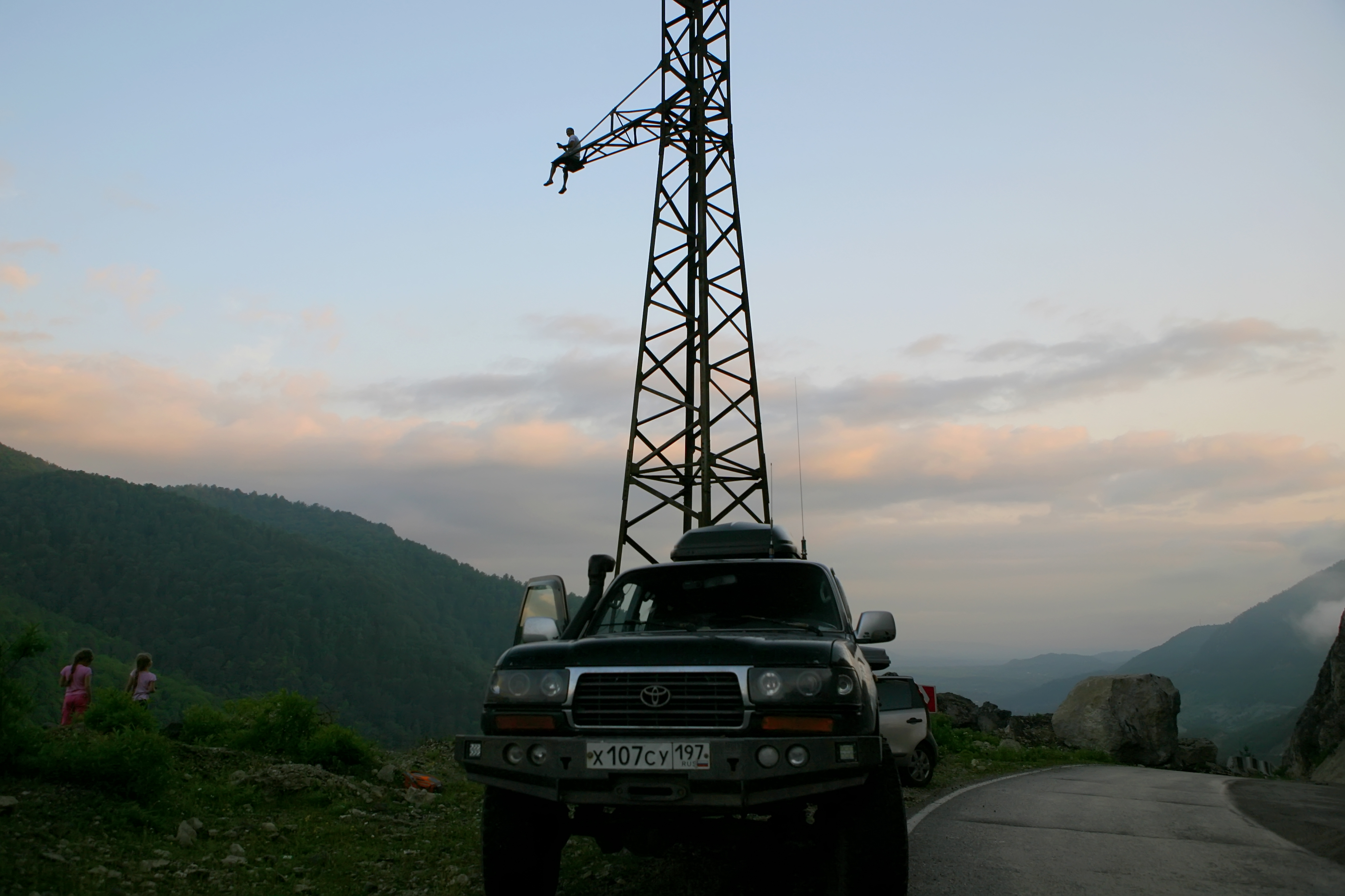 Леша уехал раньше и уже побывал в альплагере Безенги перед тем, как встретить нас в душном аэропорте жаркого июньского Нальчика. Купив черешни и тормозной жидкости и залив 200 литров солярки в расширенный бак Крокодила, мы двинулись через Владикавказа на юг по Военно-Грузинской дороге, ведущей вдоль р.Терек к КПП Верхний Ларс на границе с Грузией (150 км). Плохой новостью стал переход российского КПП на 12-часовой режим вместо круглосуточного и громадные пробки по обе стороны границы. На ее прохождение стало уходить 5-8 часов, в то время как прохождение грузинской таможни отнимало 15-20 минут с заходом в Duty free и туалет (на нашей стороне нет ни того, ни другого).