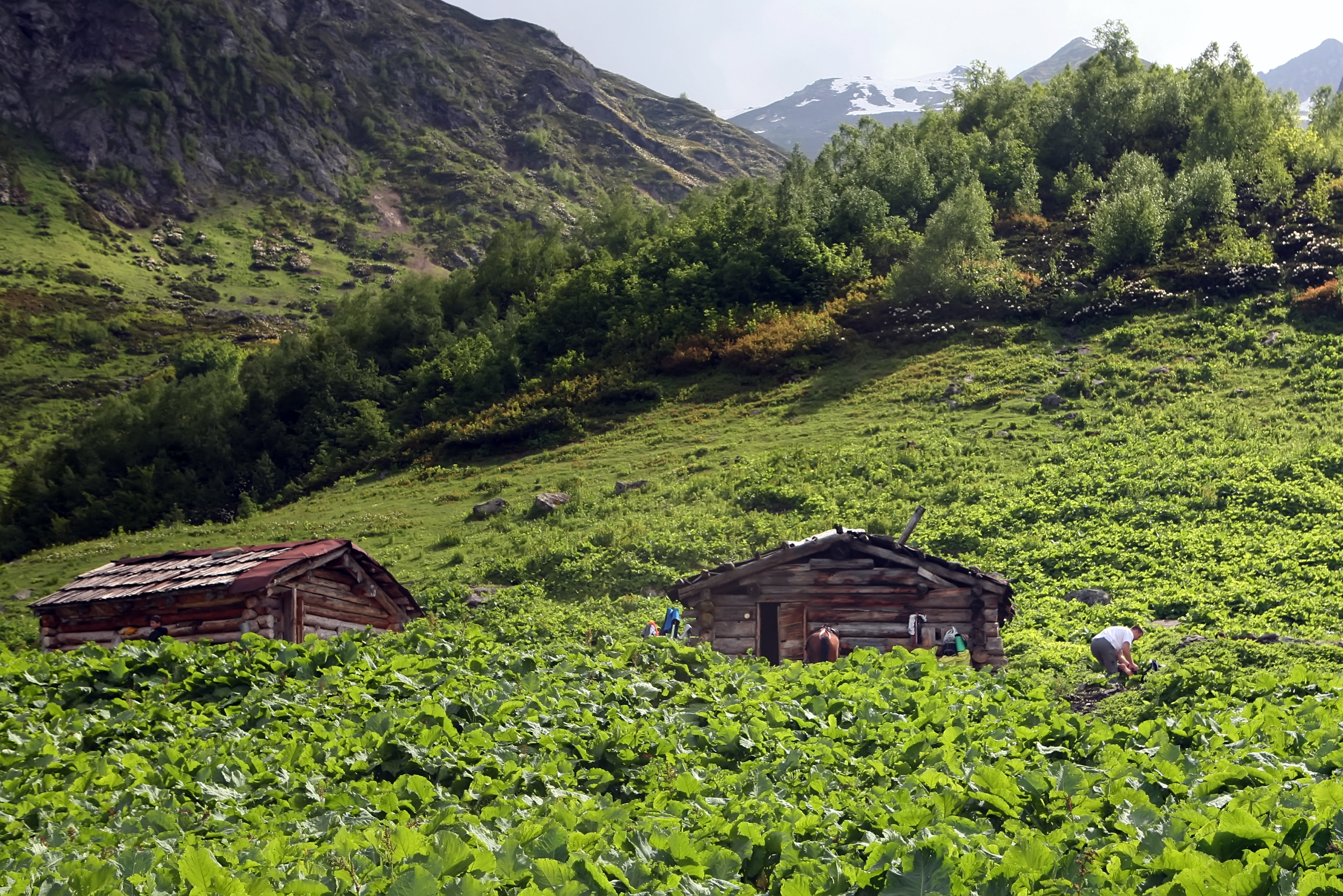 Утром начались сборы. Колоритные братья-сваны нагрузили грустного ослика баулами со снаряжением, мы же отправились налегке. Из деревни в 20 домов, населенной представителями одной единственной фамилии, в сторону альпийских лугов и вершин Сванского хребта ведет обычная проселочная дорога, постепенно превращаясь в пастушью тропу. Набрав почти 1,000 м, мы остановились на ночлег в двух пастушьих домиках на высоте 2,700 м с живописным видом на грозный Кавказский хребет.
