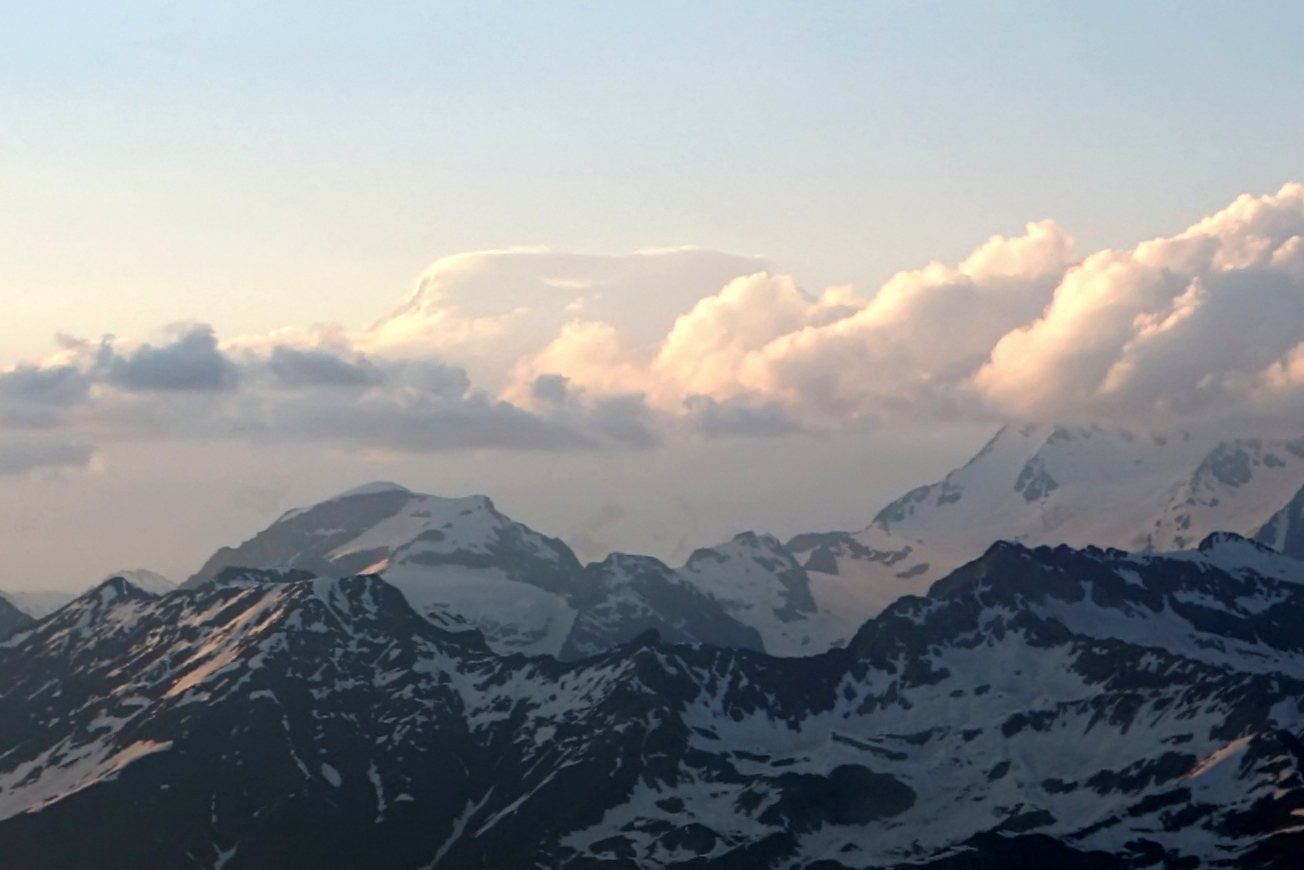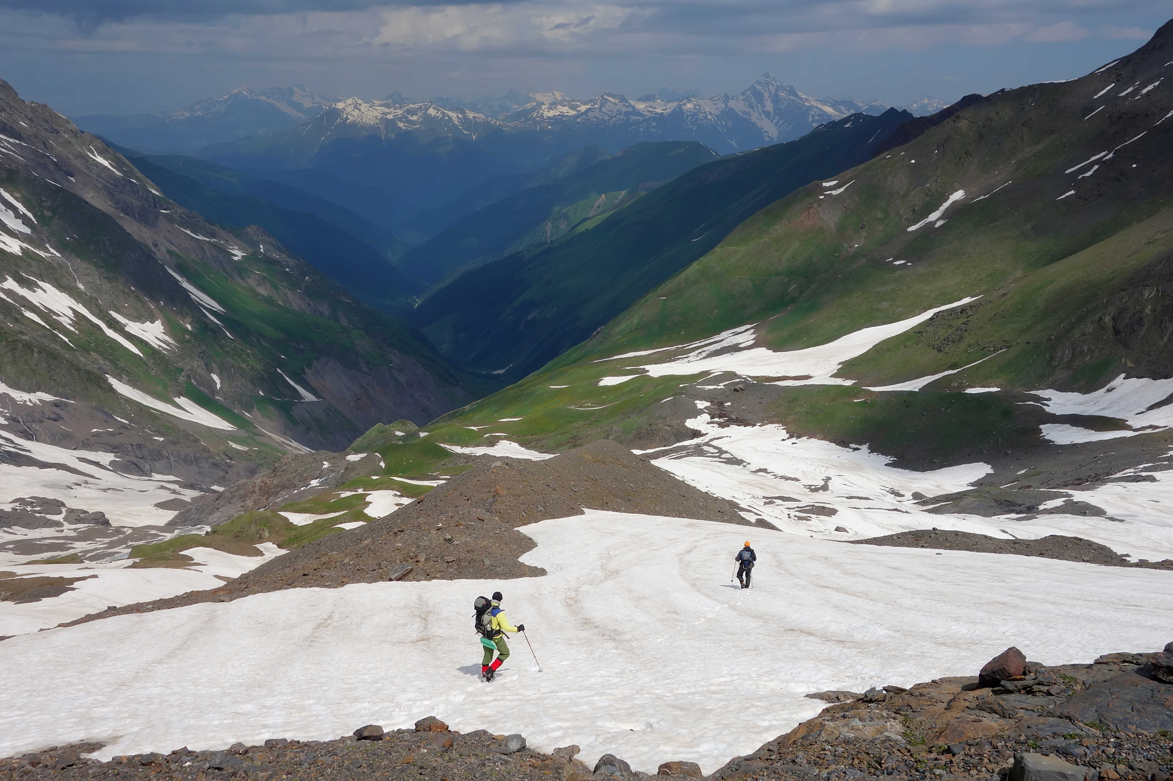 Несколько сумбурные с непривычки утренние сборы – и вот уже выходим в сторону высшей точки Сванского хребта, вершины Лайла (4,008 м). Тропинка сначала спускается на 250 м вниз, в долину с разрушенной лавиной хижиной, откуда дальше только вверх около 800 вертикальных метров до вершины. Подъем дается достаточно тяжело, акклиматизации не хватает. Несмотря на то, что погода в принципе ясная, Лешу (единственного) смущают редкие обрывки облаков, появляющиеся из-за хребта.