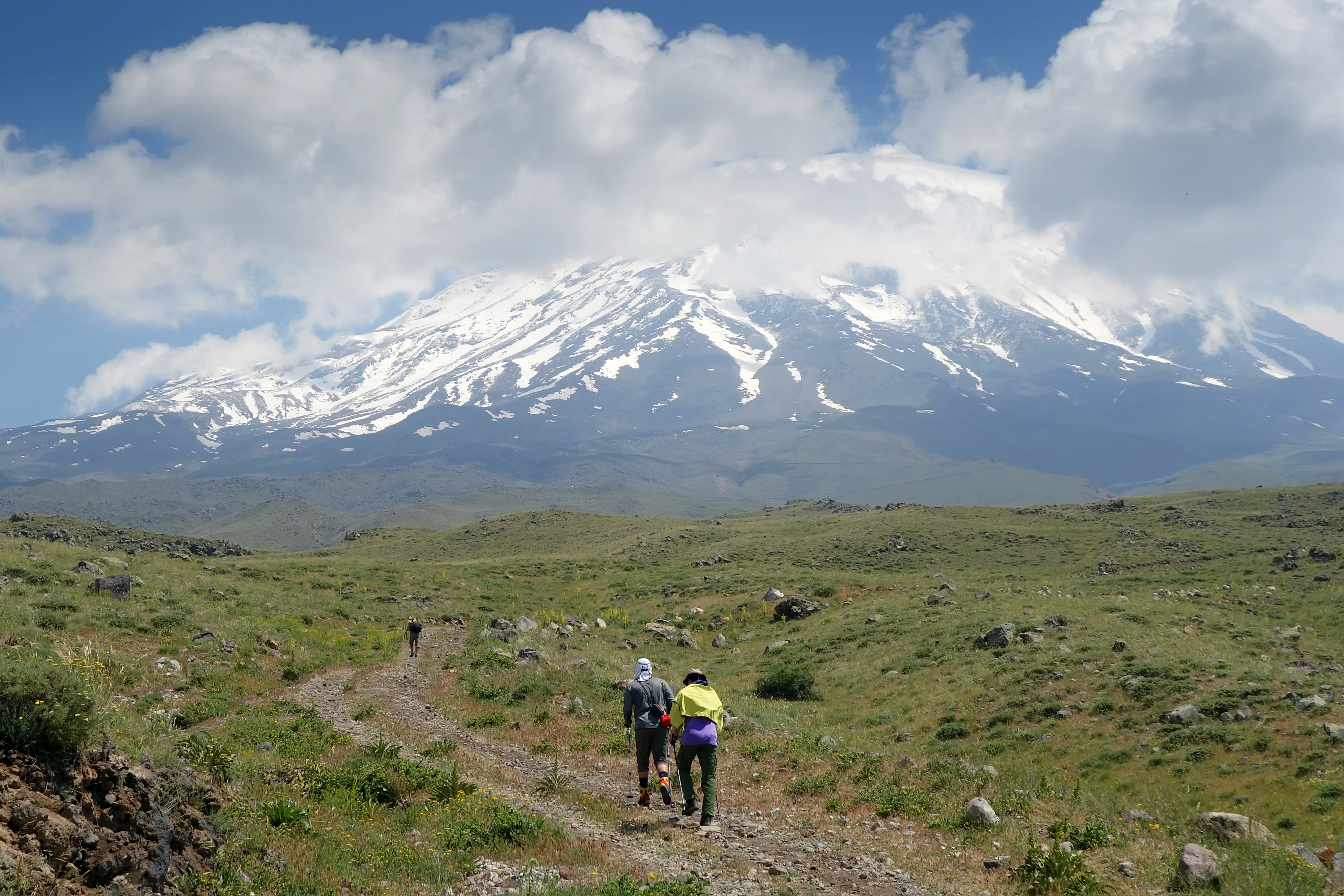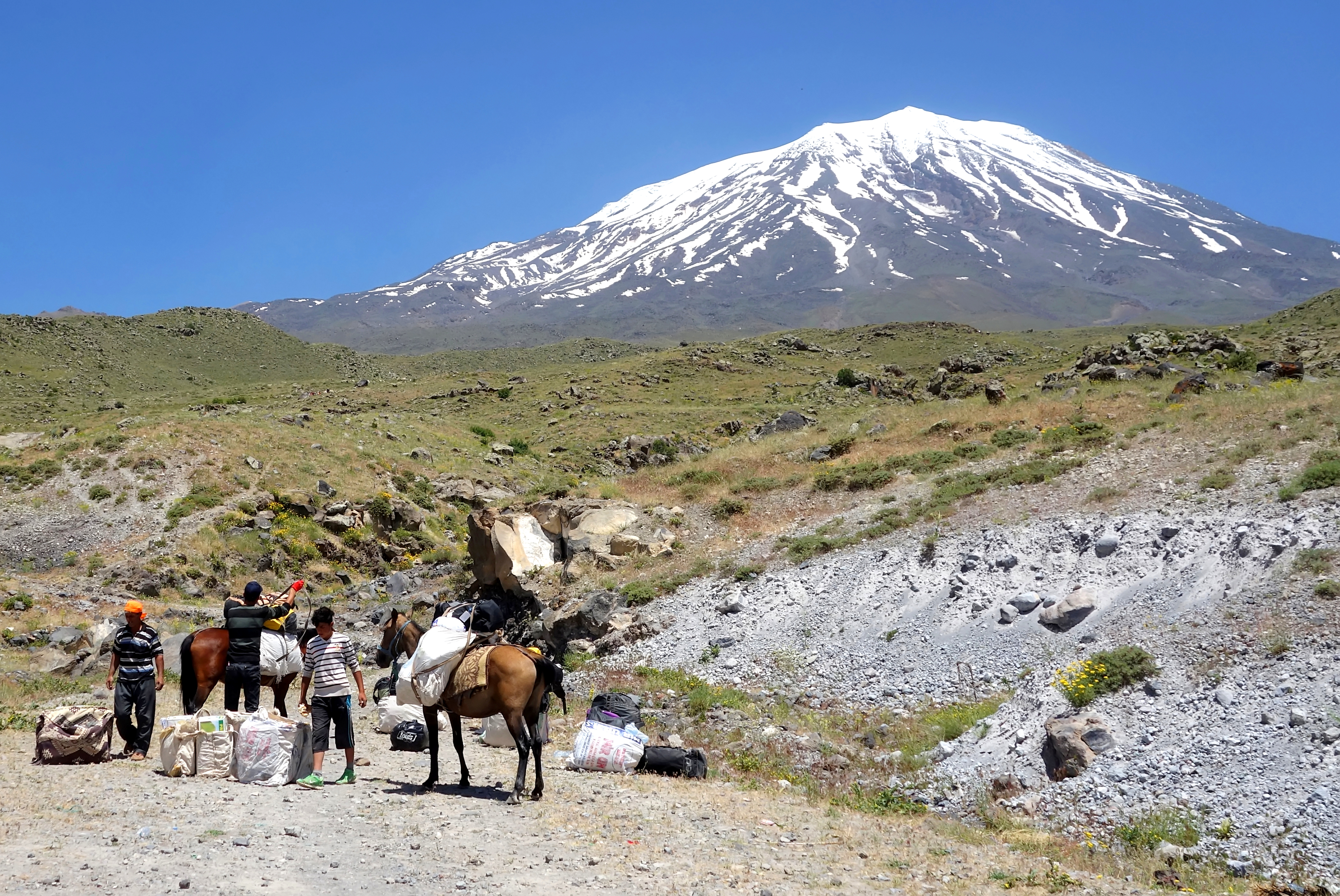 На машине нас подвезли от отеля к началу тропы. Отсюда предстояло набрать около 2,000 вертикальных метров до лагеря на высоте 3,700 м. Самое тяжелое погрузили на лошадь, хотя дошла она в результате только до 3,200 м. Дальше не пустил проводник, опасаясь за здоровье молодой кобылы, за которой неустанно следовал резвый жеребёнок. А еще отсюда открывался впечатляющий вид на бесконечное Армянское нагорье, и можно было живо представлять, как по этой громадной разогретой сковороде на перепутье цивилизаций проходили могущественные армии персов, османов, русских.