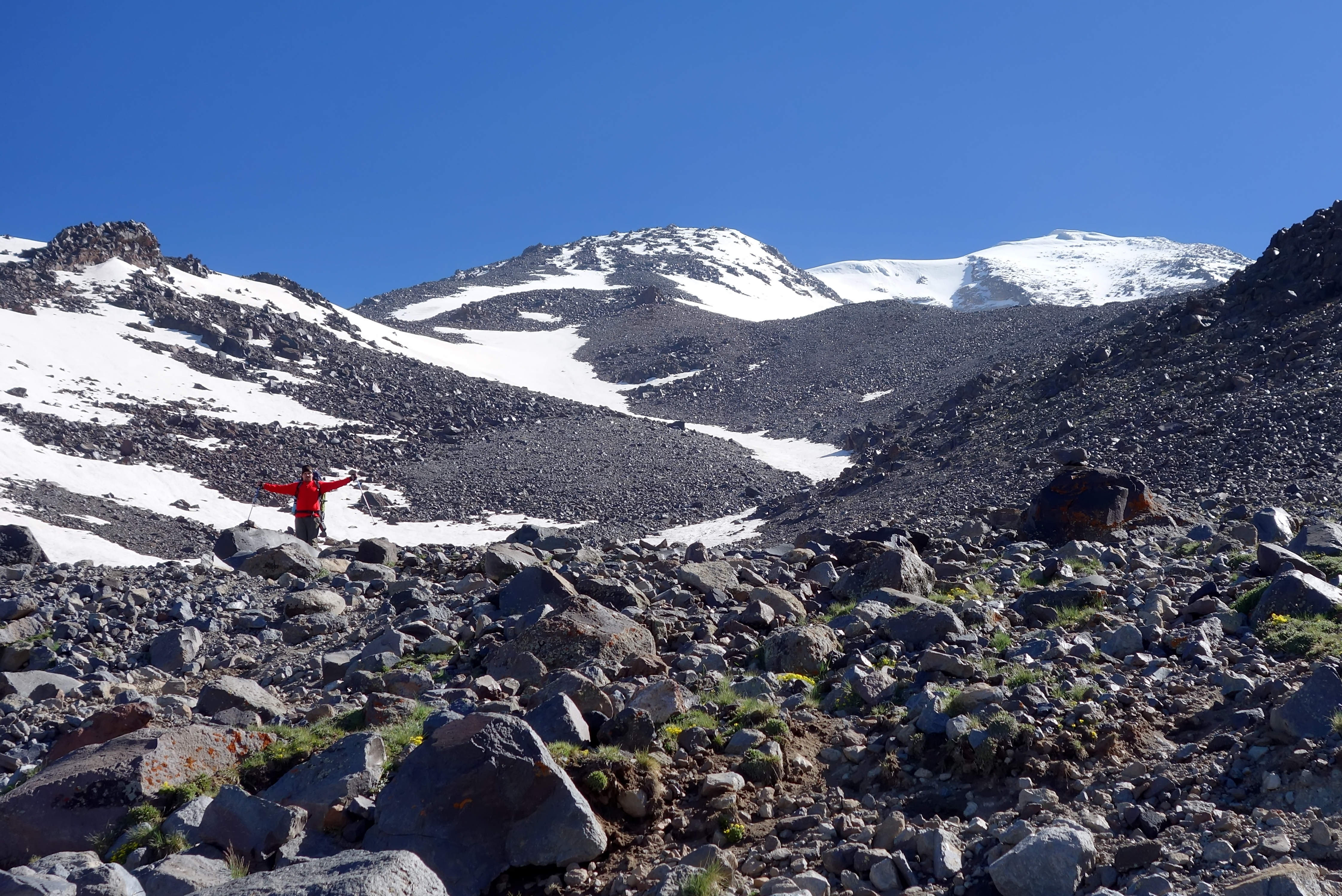 Спуск был невероятно монотонным – гора вообще не отличается разнообразием рельефа, а тут еще и почти 1,500 вертикальных метров вниз. Тропа круто петляла по каменистому склону, что удваивало пройденное расстояние. Но постепенно теплело, пару раз пришлось останавливаться и снимать по слою теплой одежды. Спуск на фоне сильной усталости занял почти 4 часа, а подъем с учетом всех остановок – 7 часов. Вышли мы около 5 утра, в 12 были на вершине и в 16 вновь оказались в лагере.