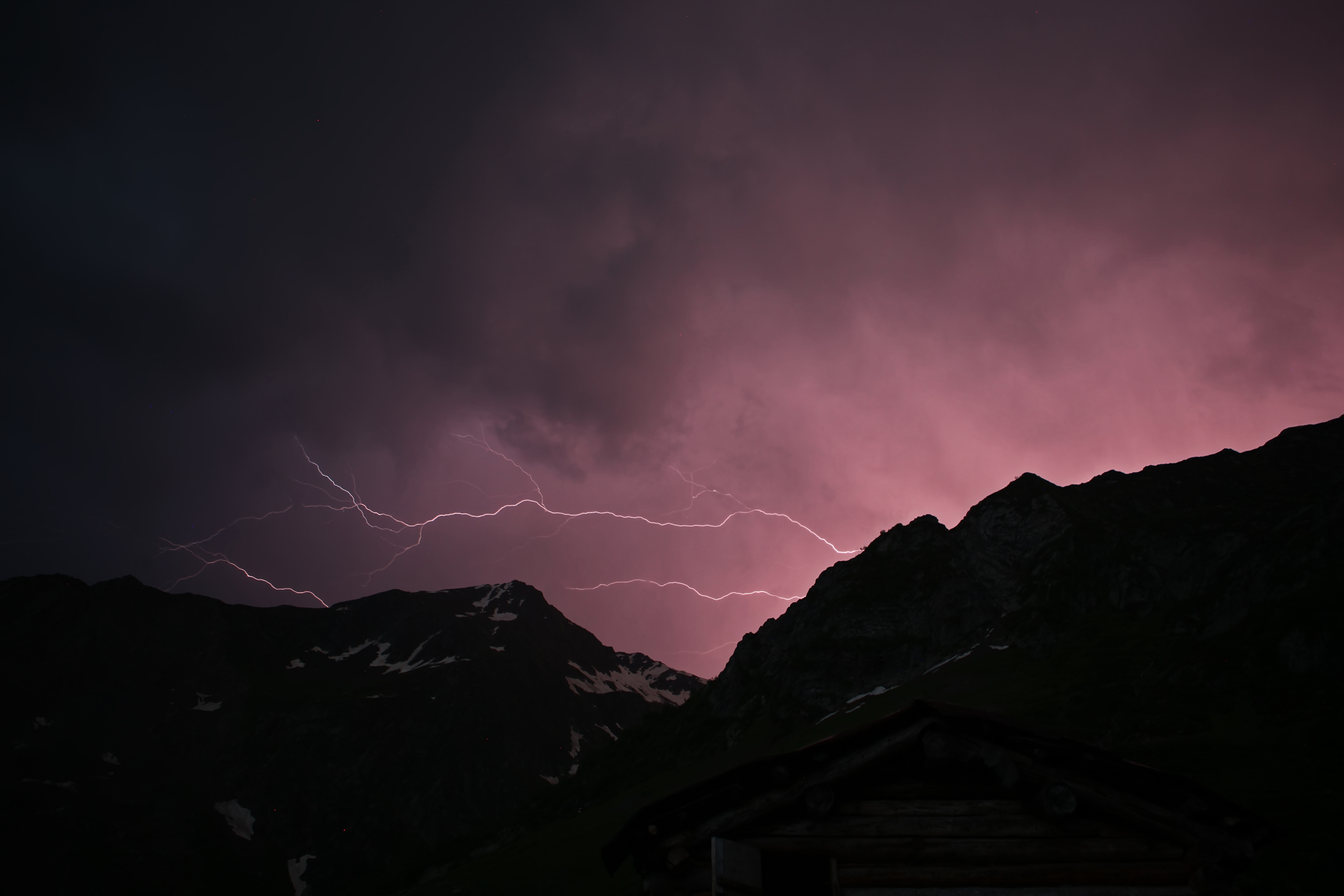 Решаем идти до начала дождя – какой дождь с ясного неба? – и уже через 30 минут делаем привал вновь на 3,400 м, когда первые капли прилетают в лицо при усиливающемся ветре. После вдумчивого анализа решаем возвращаться и собирать лагерь. Леша считает, что дальше будет только хуже и на перевале делать нечего. К расстройству от невозможности увидеть красавицу Лайлу добавляется беспокойство за акклиматизацию без второй ночевки на высоте. Срочно убегаем вниз и, едва войдя в домик, слышим, как частая дробь капель начинает колотить по крыше, постепенно сливаясь в мощный непрекращающийся гул. Раскаты грома чуть ли не оглушают, а молнии рвут черную тень нашего перевала. Мы боремся с локальными затоплениями, а Леша фотографирует стихию (ниже его работа).