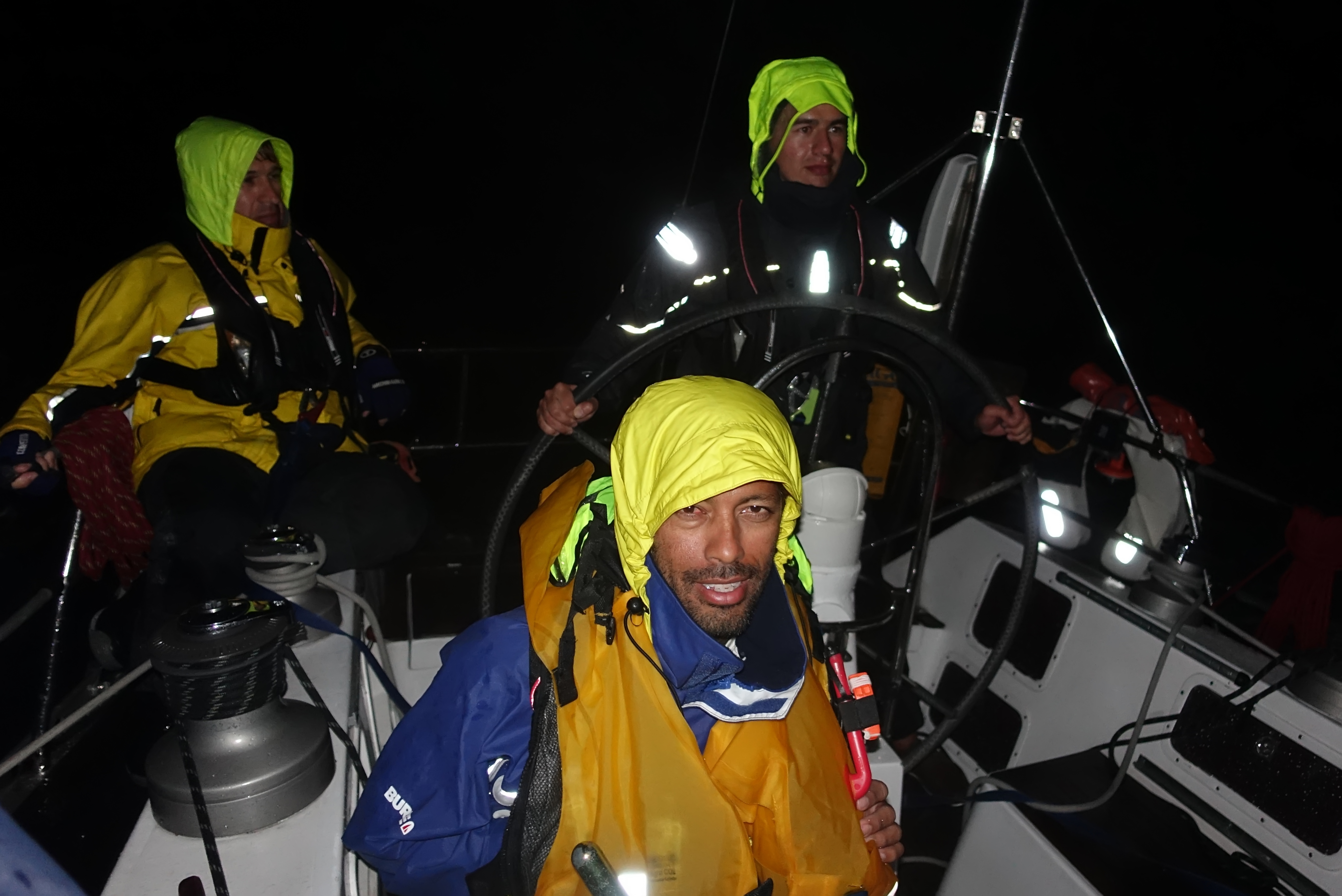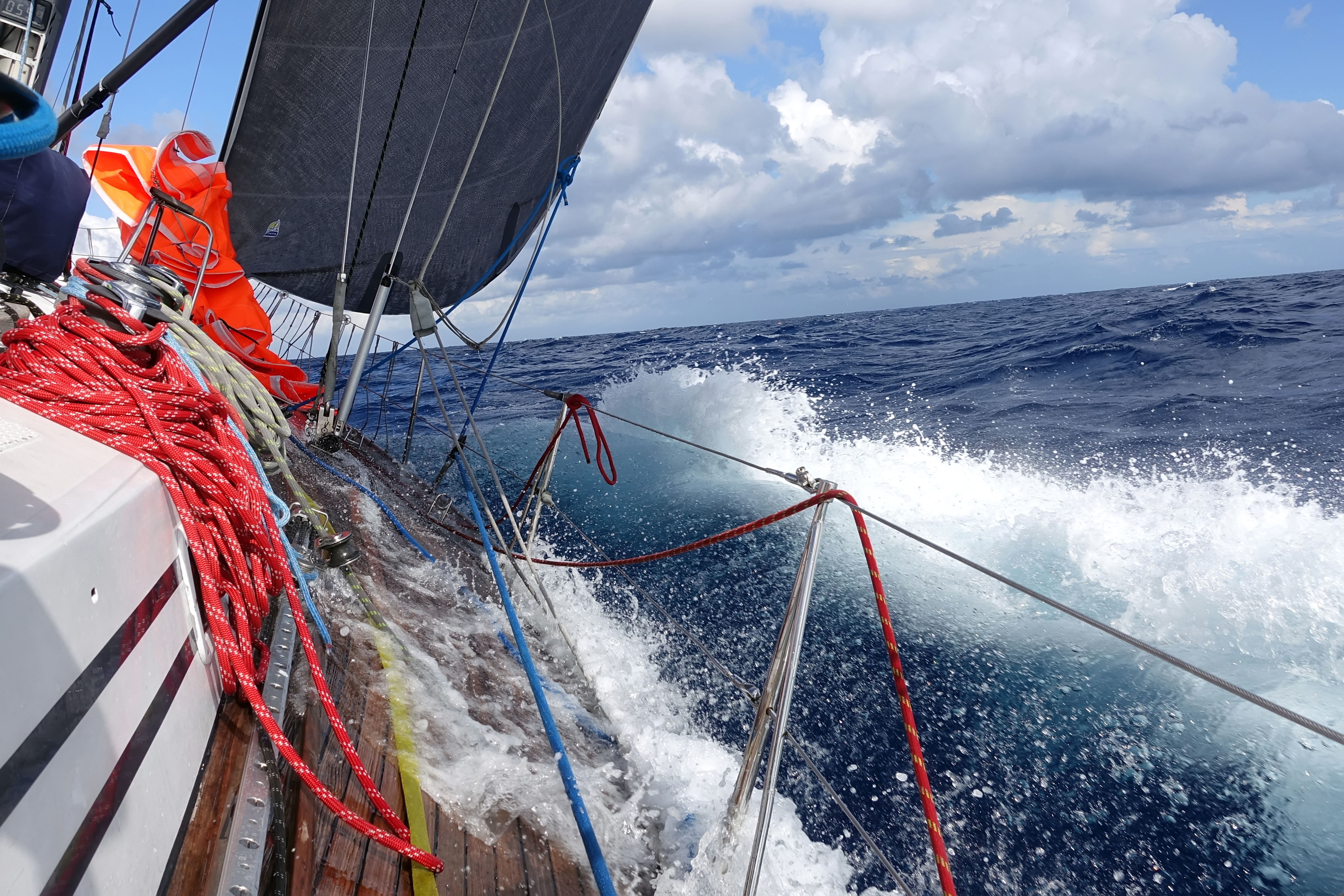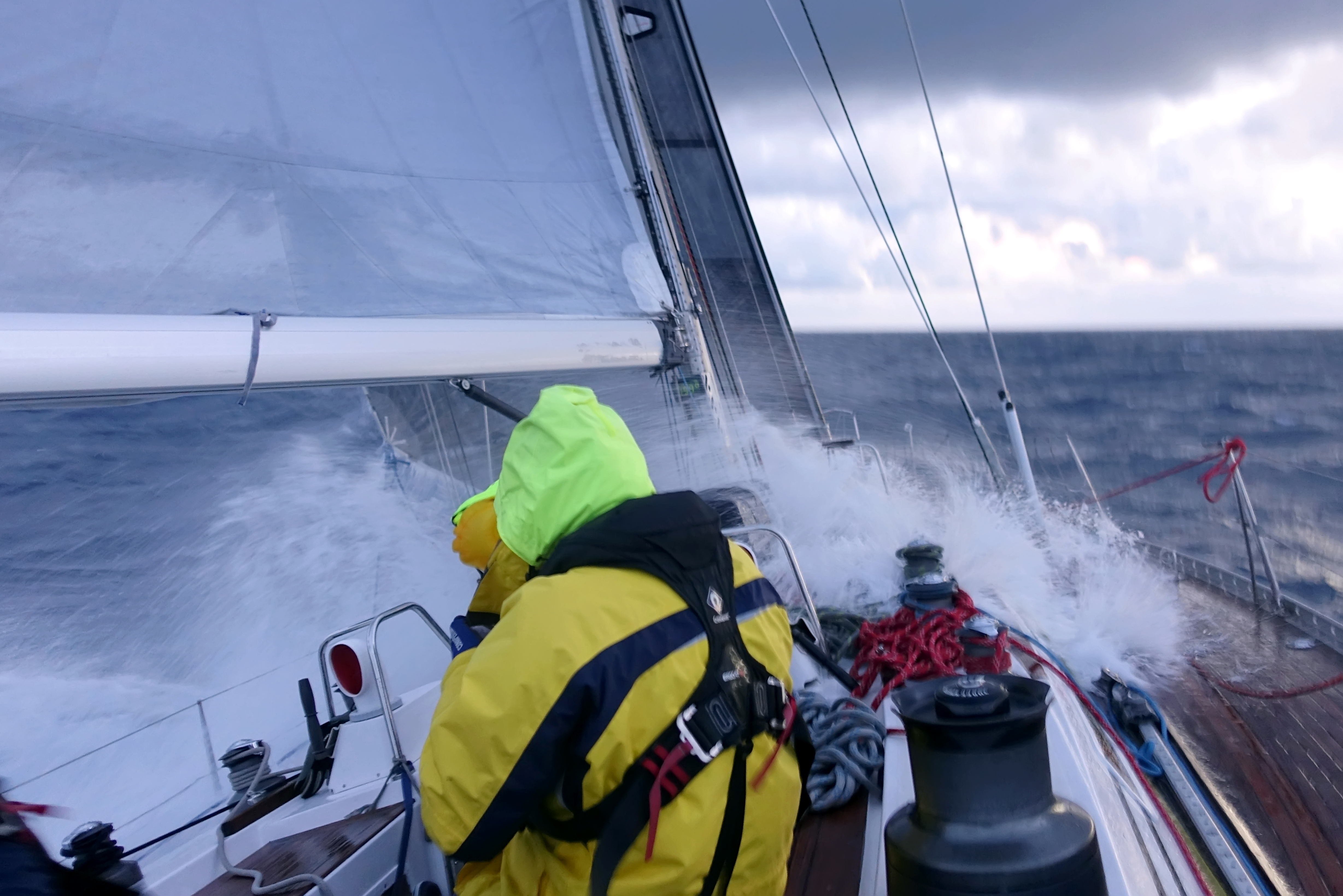 Прямо перед нашей вахтой в 16 часов небо темнеет и становится грязно-серым, и буквально в течение получаса ветер крепнет до 20-25 узлов (40 км/ч). Наша вахта ставит рифы на грот и меняет большой матерчатый стаксель на меньший и прочный кевларовый. Сбоку начинает приходить волна, захлестывая нос и кокпит. Мы в непромокаемых костюмах и спас-жилетах пристегнуты страховками к штормовым леерам, протянутым вдоль бортов. Лодка идет с отличной скоростью более 10 узлов, почти вдвое быстрее вчерашнего. но порывы ветра достигают 35 узлов (65 км/ч) и адреналин просто хлещет через край.