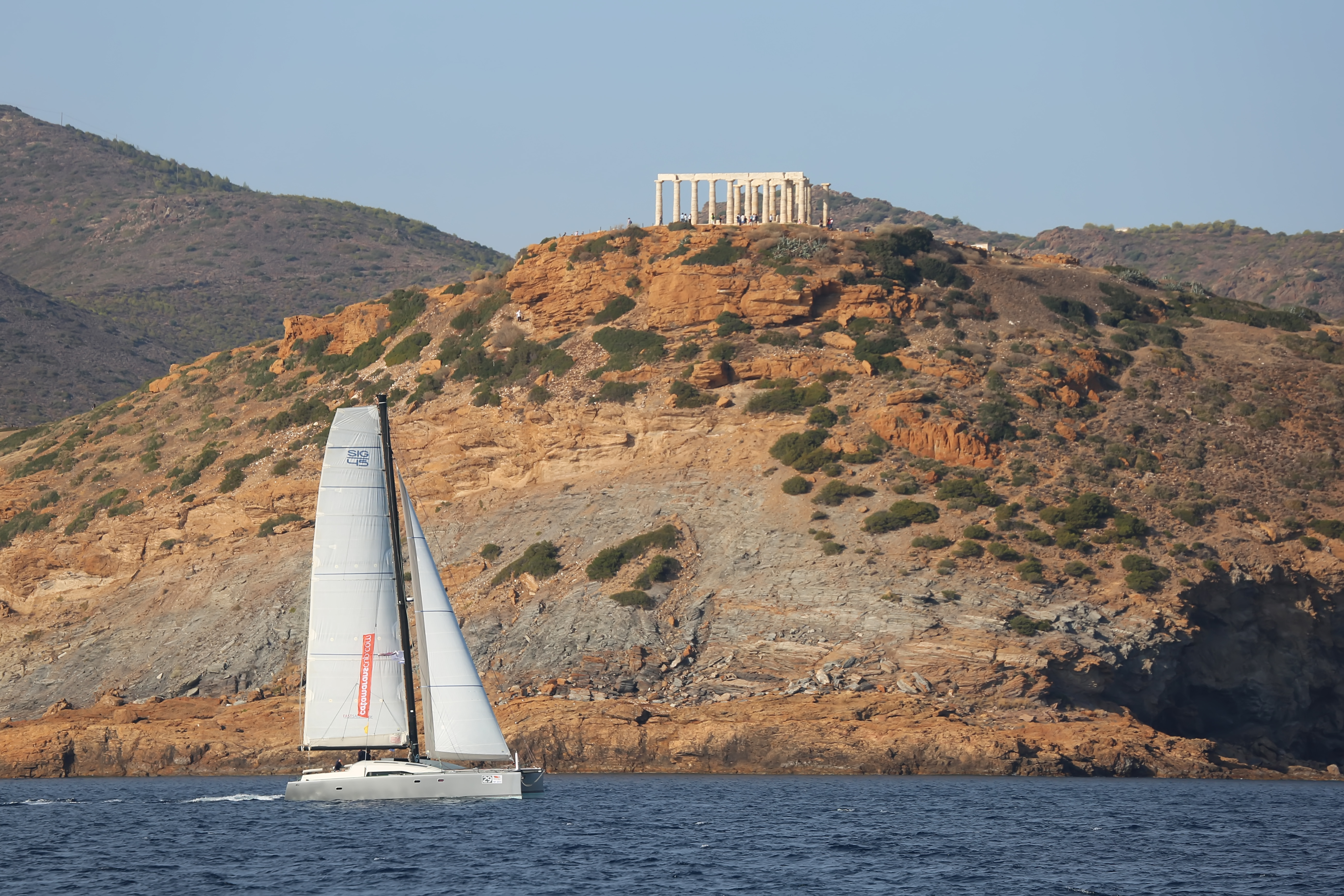 Ветер после полудня начал стихать, и к промежуточному финишу, оказавшемуся в результате зачетным, мы пришли в первой пятерке. Помимо фото-съемки преследующего нас флота, команда занималась обсуждением хитросплетений греческой истории. Начавшись с руин храма Афродиты на живописном утесе, культурно-лингвистическая дискуссия Паши и Андрея Х. добралась до партизанского движения Второй Мировой и закончилась достойной ничьей.