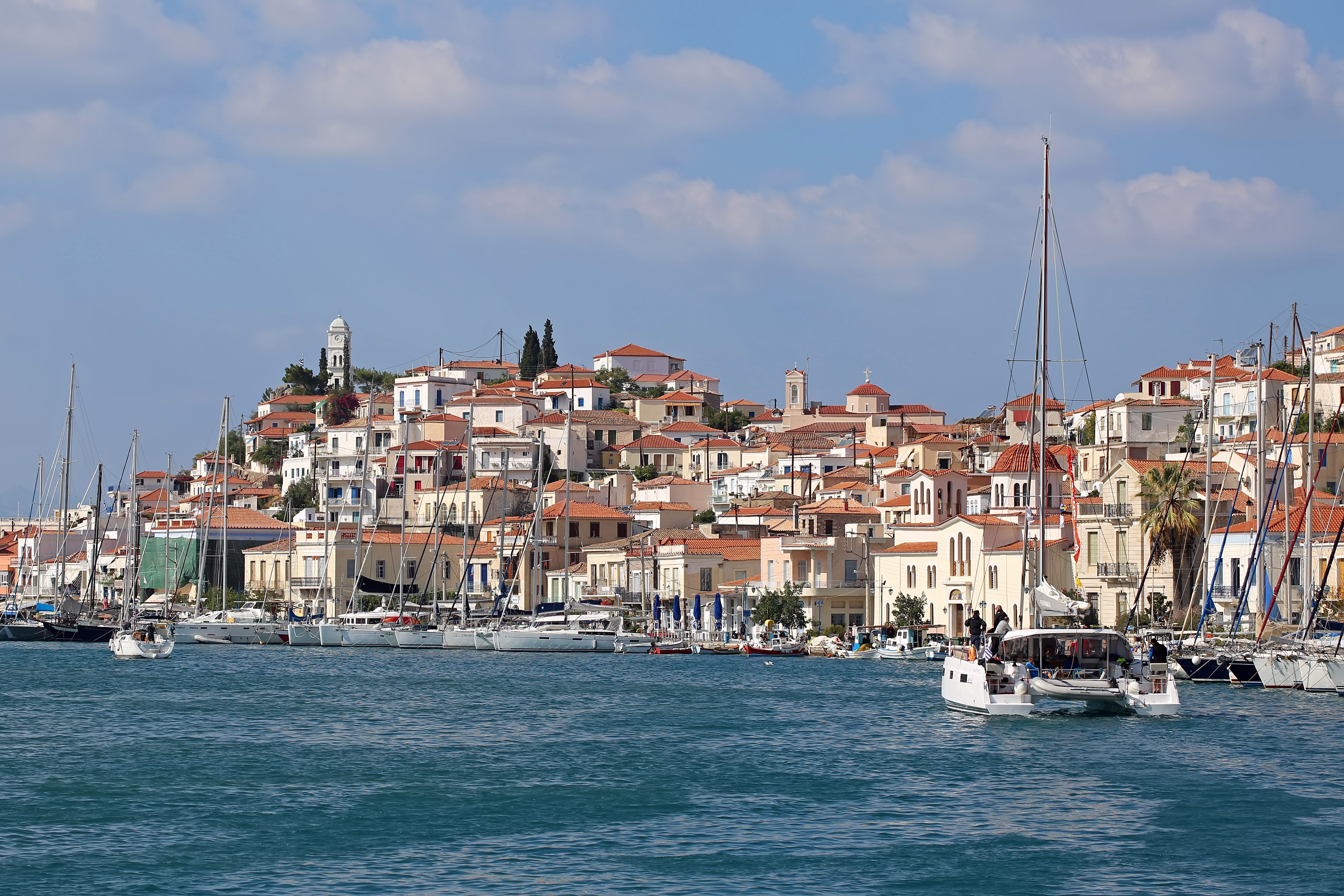 Утреннее усиление ветра внесло коррективы – вторую гонку было решено провести сразу на Порос, минуя Китнос. Иначе фронтальная волна и крепкий ветер не дали бы назавтра пройти самую длинную часть дистанции засветло. От Кеа же удобный боковой ветер с порывами до 30 узлов позволил флоту весело долететь до Пороса в плотной и динамичной гонке и спрятаться в городке за островом.