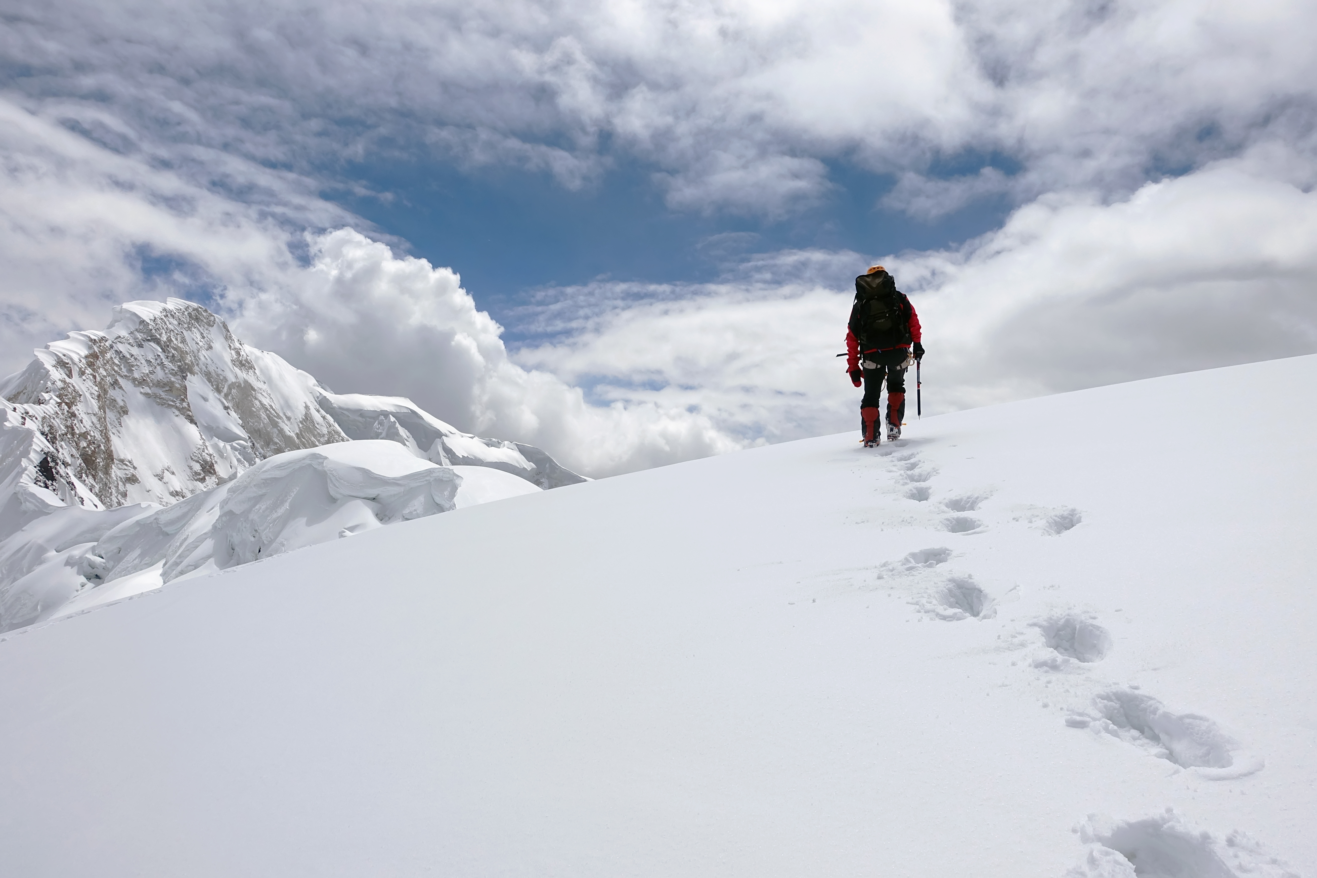 Возможность проверить себя как раз была на подходе. Погода начала портиться, и контур горы еле проглядывал сквозь туман, облачность и идущий снег. Но если лезть сейчас, то как раз к штурму можно надеяться на улучшение. Огорчал рюкзак. Мы несли в Л3 (5900 м) еду на неделю, спальник, горелку, по 2 газовых баллона, пуховые одежду и варежки, медицину. По свежему снегу тропили фактически заново, что значительно замедляло ход и забирало силы.