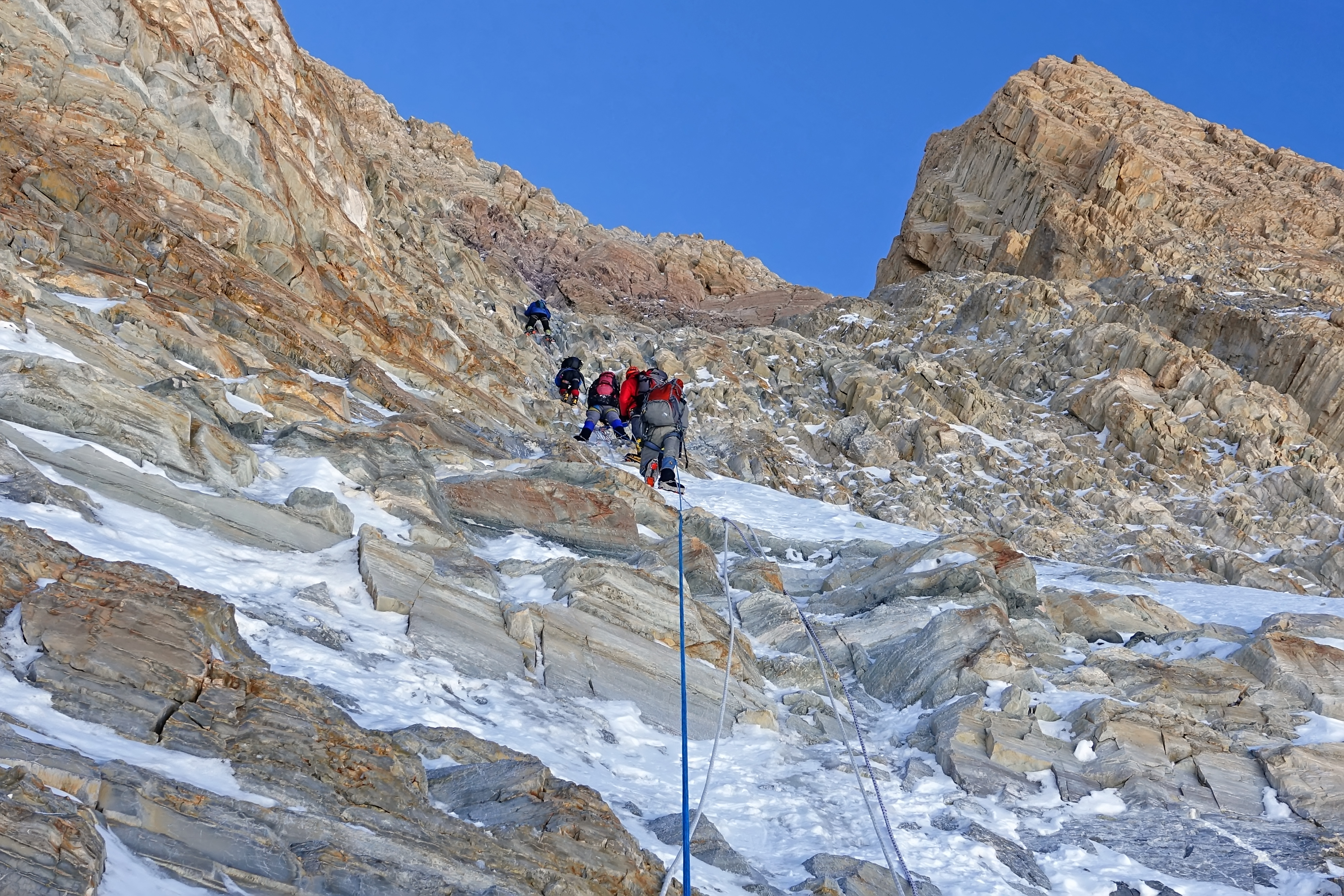 Дошли до скал. Слышны лишь скрип кошек и собственное дыхание. На склоне еще с десяток фонариков северян и южан. Ночью идти хорошо – не ощущается масштаб задачи, мощь горы, перед глазами только ближайшее препятствие. Потом будет сложнее: видны перебитая оплетка веревок, обрыв на юг, глыба пирамиды Хана. До 6400 дошли за 3 часа, когда рассвет начал выхватывать из темноты соседние пики и окрашивать их нежно-розовым.