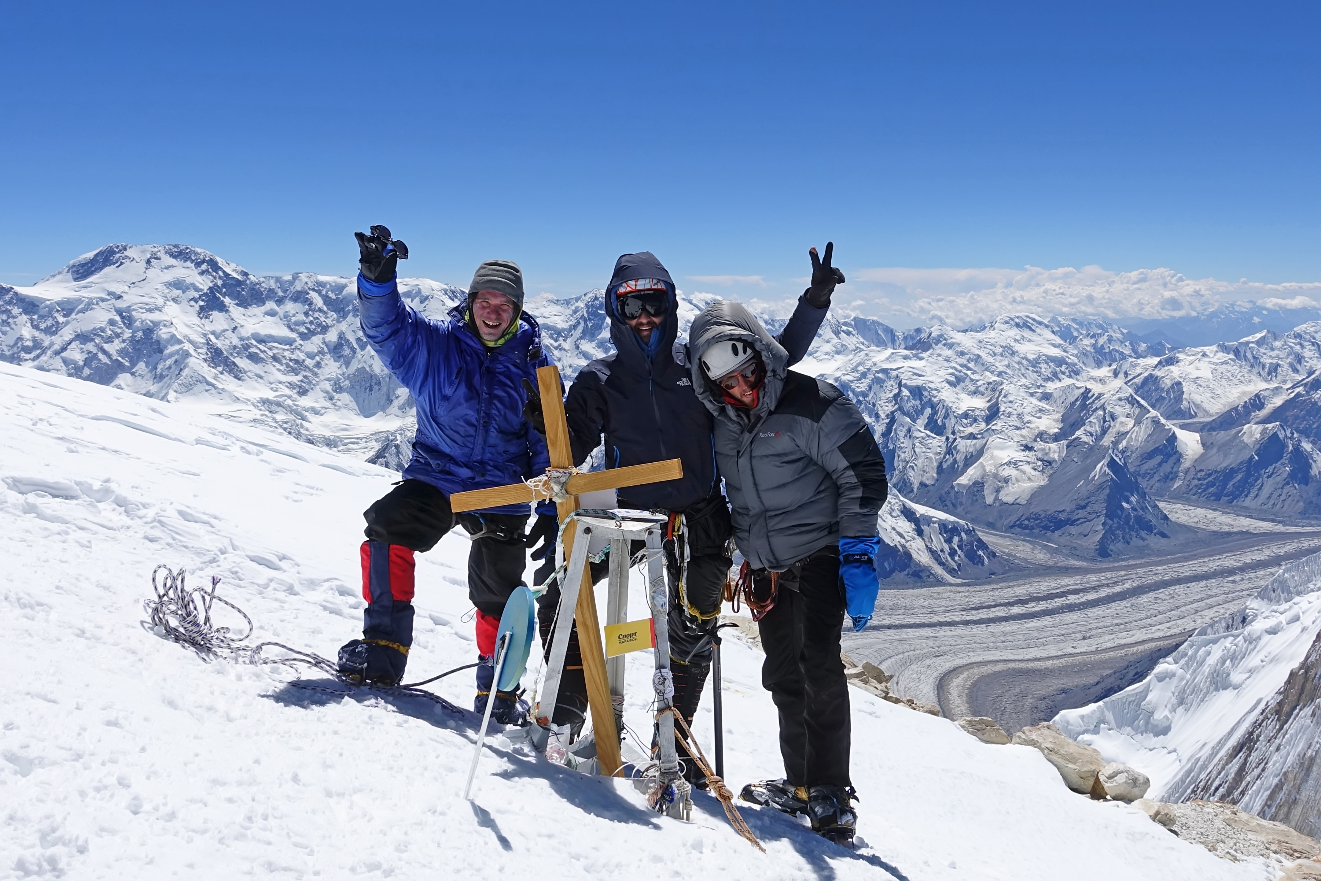 Признаться, я до последнего момента не ощущал уверенности, что все может получиться. Последние часы были очень тяжелыми физически, и я боялся, что не хватит сил или времени и придется разворачиваться. На вершине первым чувством была не радость от сделанного, а облегчение, что выдержал. Сергей и оба венгра зашли на вершину через час, около 12, мы же с Володей поднялись чуть выше креста, на снежный карниз вершинного купола.