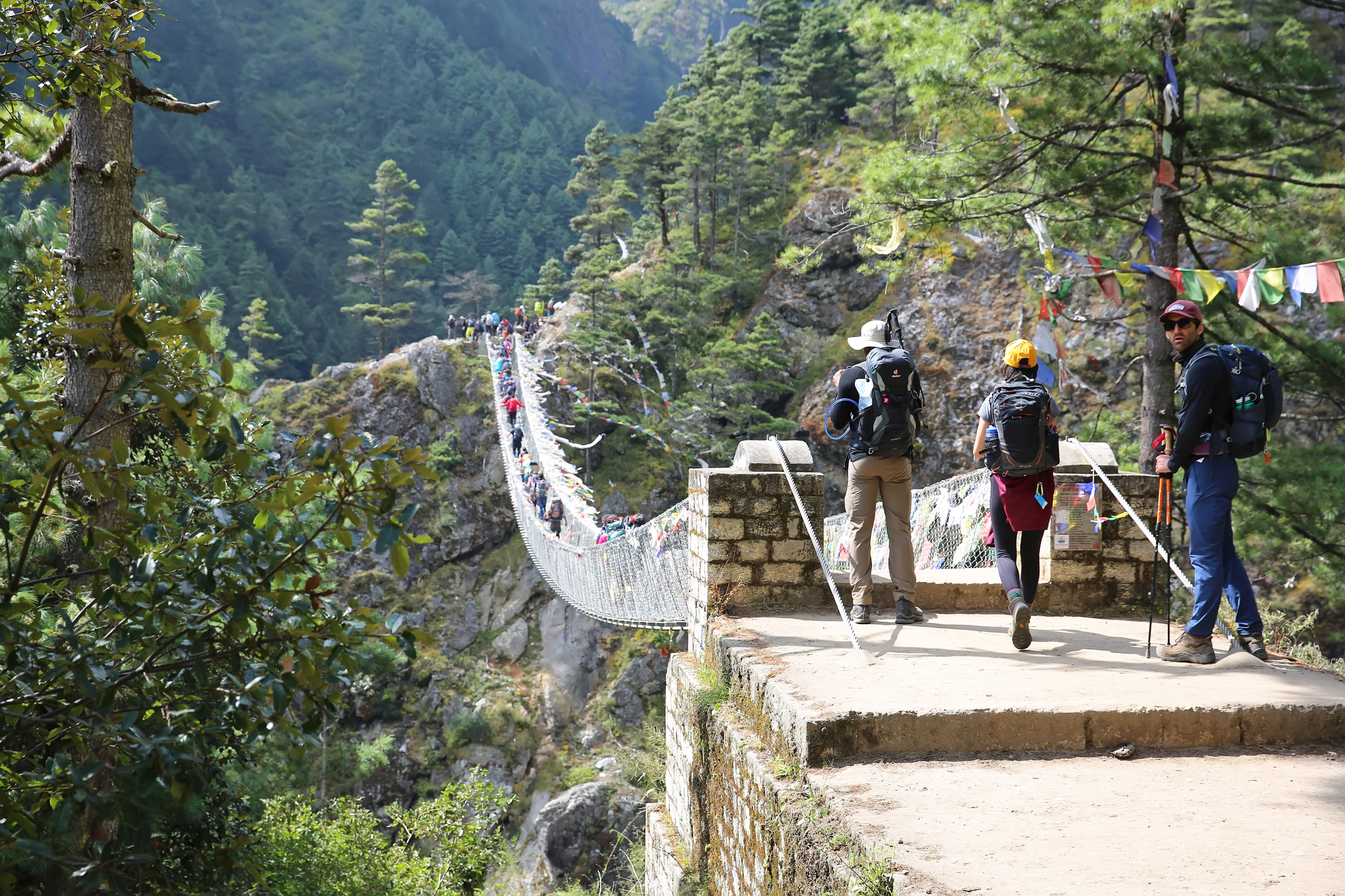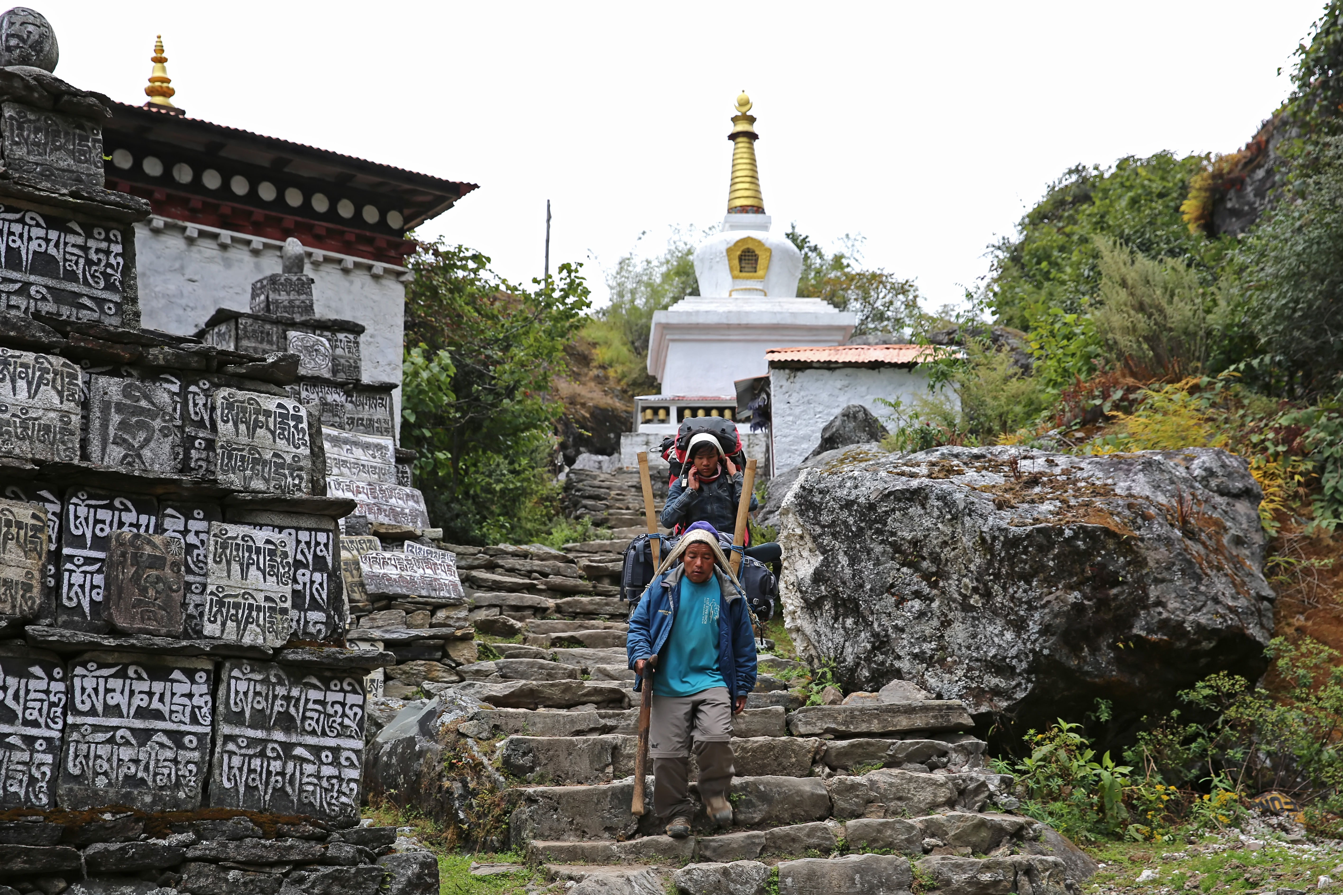 Нам же предстояло еще сделать 4-часовой переход до деревушки Phakding, где планировалась первая ночевка в шерпском гостевом домике. Было полное ощущение, что мы оказались в другом веке. Древние храмы и ступы, которые нужно обходить справа; высеченные на камнях индуистские мантры; люди, несущие грузы в корзинах на лямках через голову; дети, играющие самодельными игрушками. 21 век выдавала только их одежда бренда North Face.