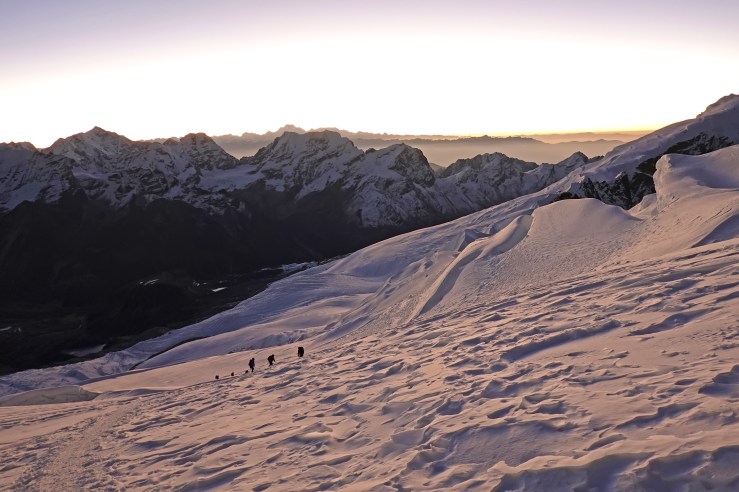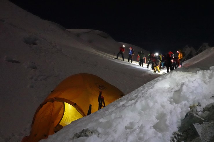 В 2 утра вcтаем по звонку будильника. Самый волнительный, самый трудный, опасный, но очень красивый день. Как всегда, чуть тревожно и немного суетливо. На улице около -15С, надеваю 4 слоя одежды: теплое термобелье, флис, теплые штаны и куртку и сверху защитный слой из гортекса. Выходим в начале четвертого. Кроме нас еще несколько групп с разницей в плюс-минус час. На пути восхождения нет скал, только достаточно пологий, с некоторыми крутыми участками снежно-фирновый склон. Идем из-за трещин в связке, долго и монотонно.
