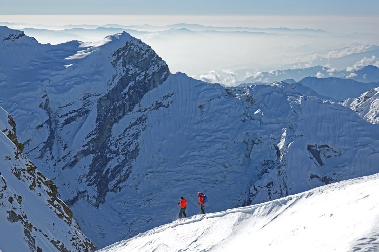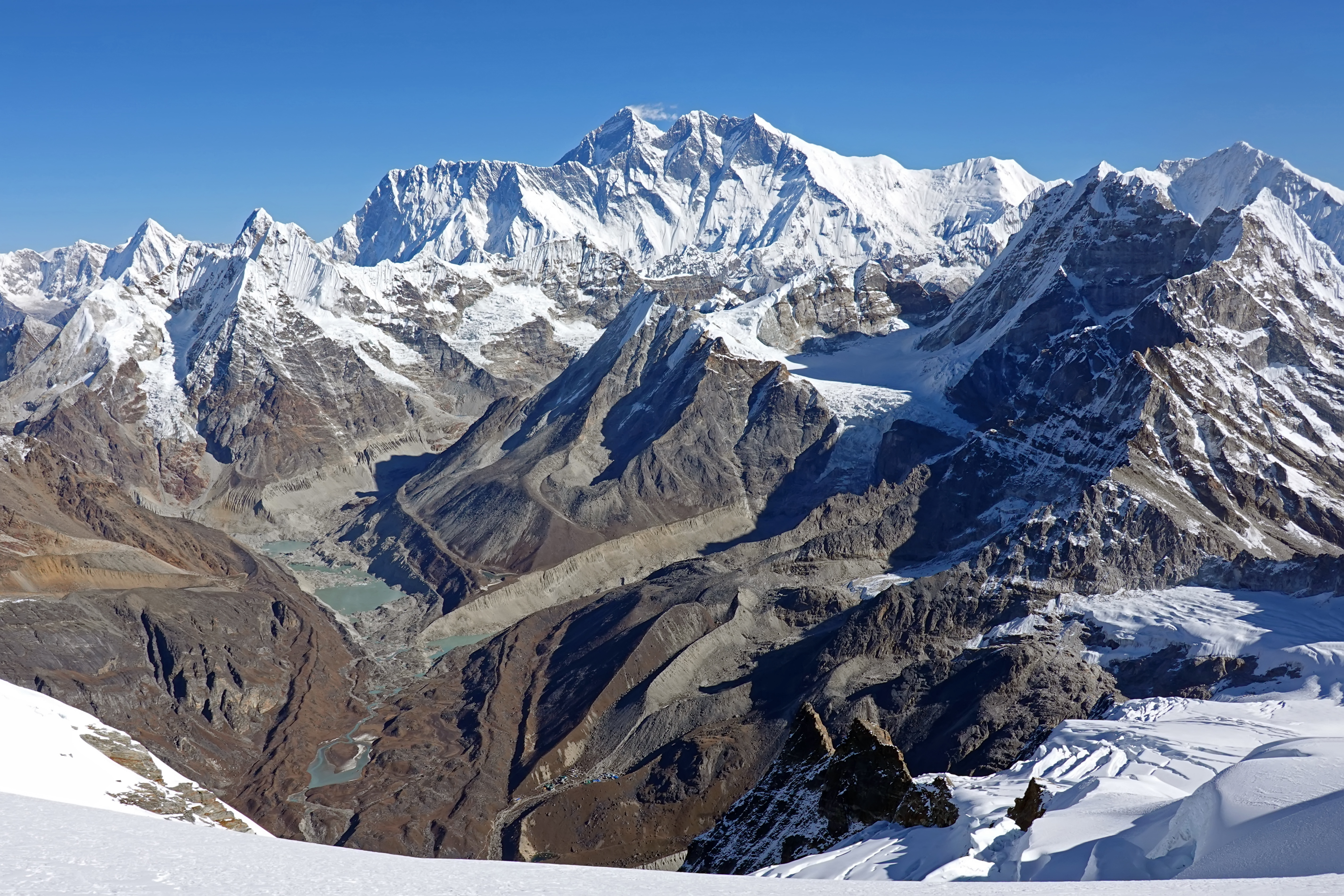 Этот последний рывок дается особенно тяжело. Начинает сказываться высота, все-таки почти 6.5 тысяч метров. На вершине неожиданно забываю, какие фото планировал делать, и снимаю все вокруг. При этом мы по-прежнему втроем в связке и отойти друг от друга далеко не можем. Со стороны наши передвижения, должно быть, выглядят довольно забавно. Вершина радует невероятной безоблачной панорамой Гималаев и видом на 5 восьмитысячников: Эверест (8848 м), Канченджангу (8586 м), Лходзе (8516 м), Макалу (8485 м) и Чо-Ойю (8201 м).