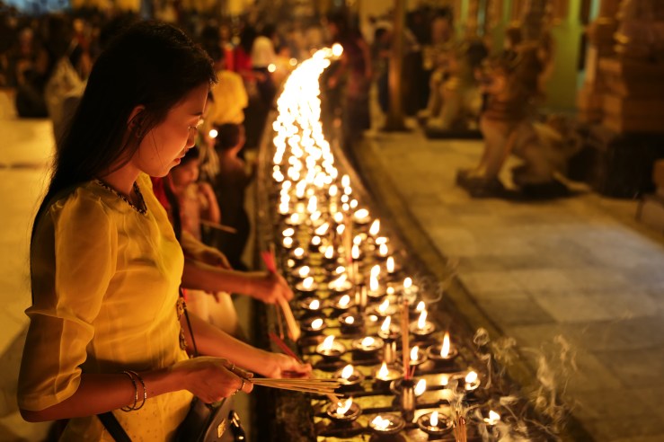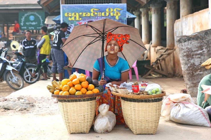 На площади перед пагодой девушки в национальных костюмах продают цветы и сувениры. Их лица украшает уникальный макияж-танака из перетертого в порошок дерева. Его носят женщины и дети, причем это не только солнцезащитный крем, но еще символ красоты и средство от сглаза и проклятий. Кстати, считается, что мьянмарские женщины – самые свободные во всем мире. Они могут выйти замуж, за кого хотят, и развестись, когда захотят. При этом все приданое и все заработанное за время замужества остается в их собственности.