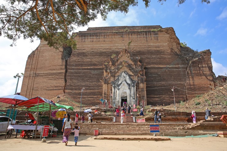 Выше по реке Иравади есть еще один древний город Мингун. Столицей он не был, но царь Бодопайя затеял здесь стройку вавилонского размаха. Грандиозная пагода должна была стать самым высоким сооружением в мире тех времен высотой 150м, как небоскреб в Москва-Сити. Но в 1813 году строительство остановилось. Астрологи предсказали царю смерть, как только пагода будет закончена. Царь все равно вскоре умер, а пагоду так и не достроили. Позднее землетрясение частично ее разрушило, а гигантская трещина расколола надвое.