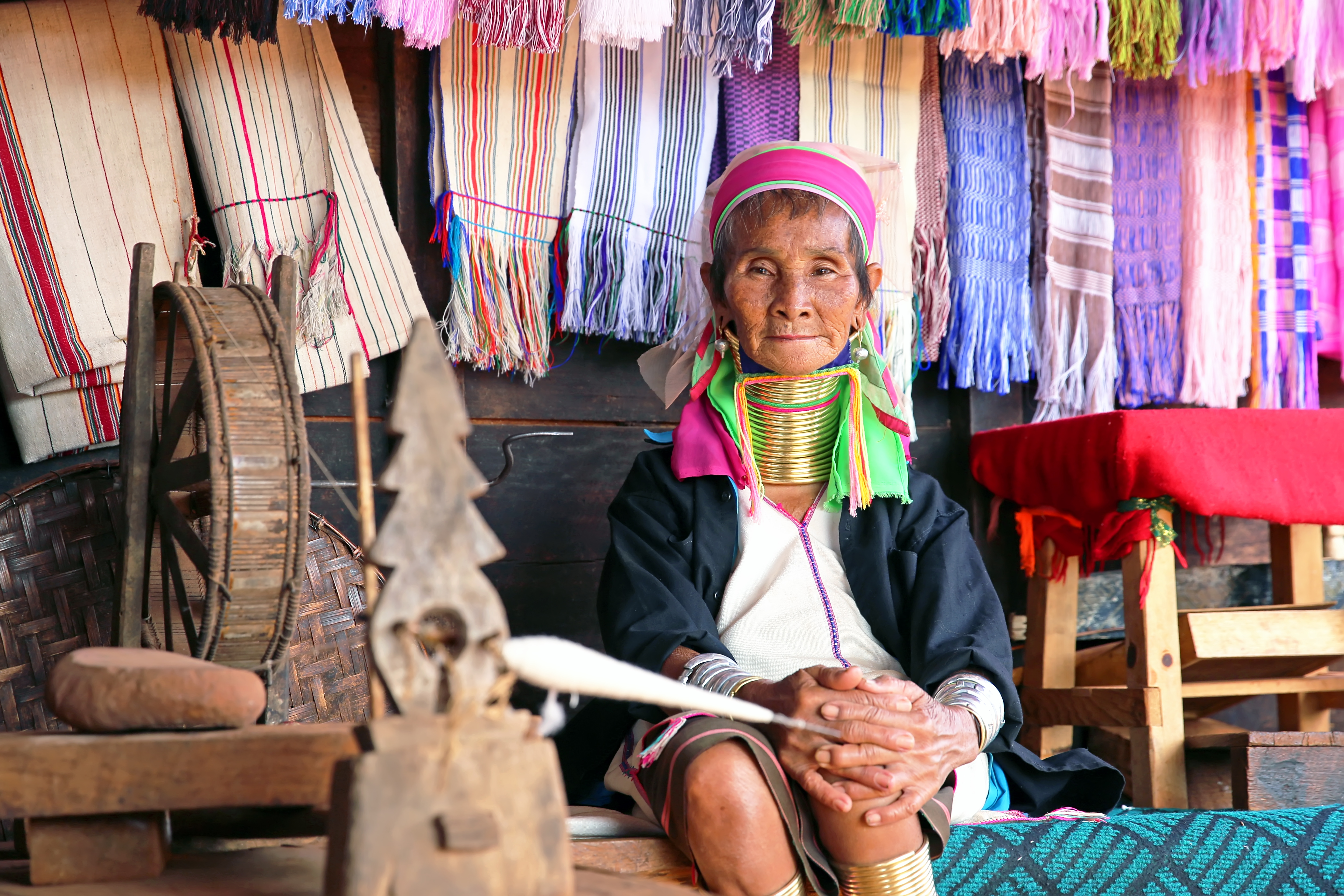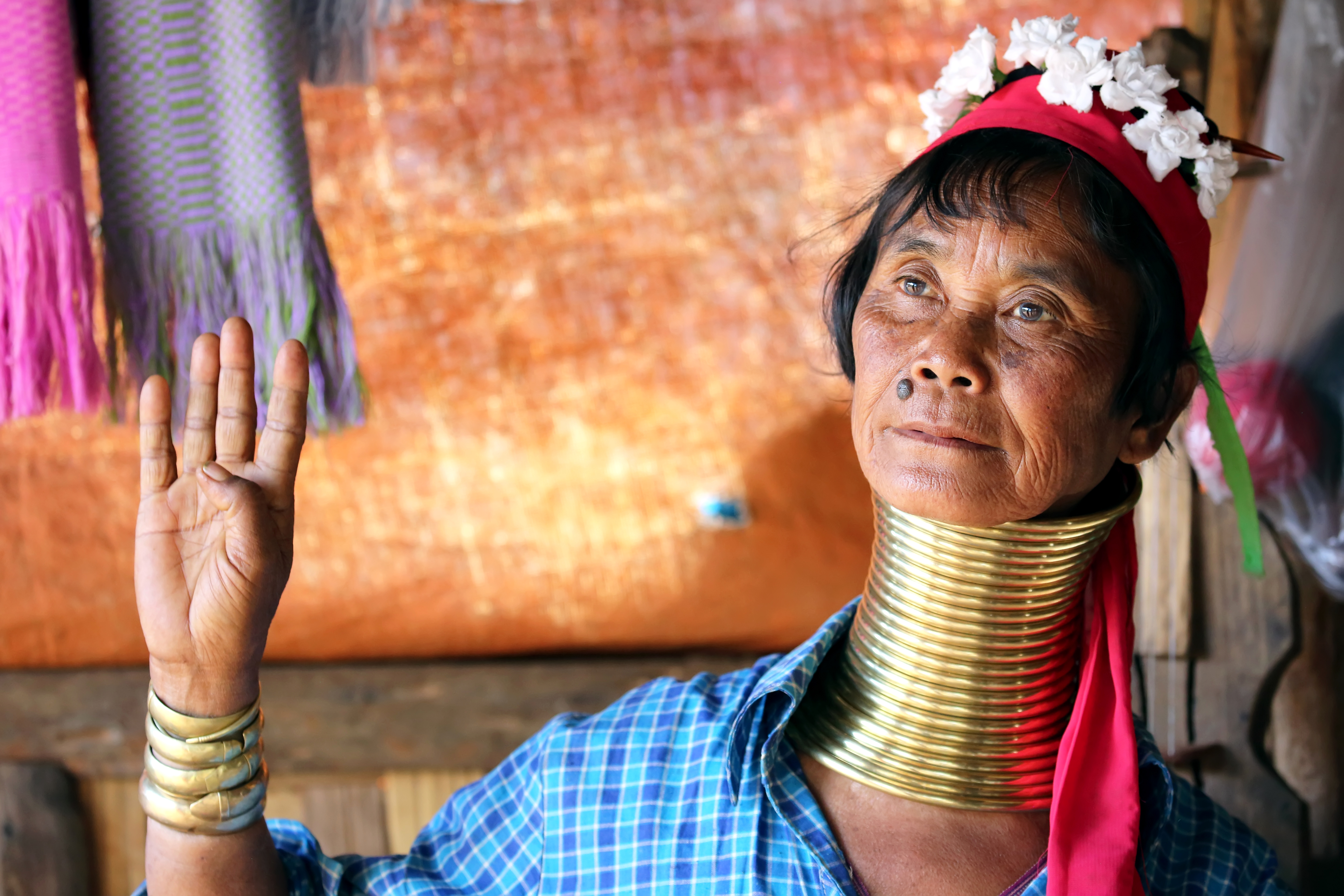 Примерно с 5-летнего возраста девочке на шею начинают надевать кольца, а точнее все удлинняющуюся спираль. Она давит вниз на ключицы и приводит к эффекту “вытягивания шеи”. К замужеству наращивание витков прекращается, и их может быть до двух десятков. Кольца по желанию или необходимости легко снимаются. Антропологи спорят о природе обычая, но в самом племени длинная шея считается признаком красоты и благополучия. Сейчас ритуал сохраняется скорее для поддержания туризма – это выгоднее, чем прясти шарфы за $1.